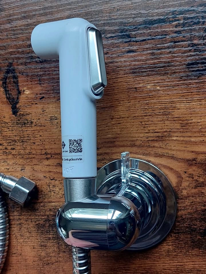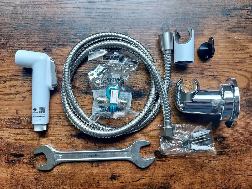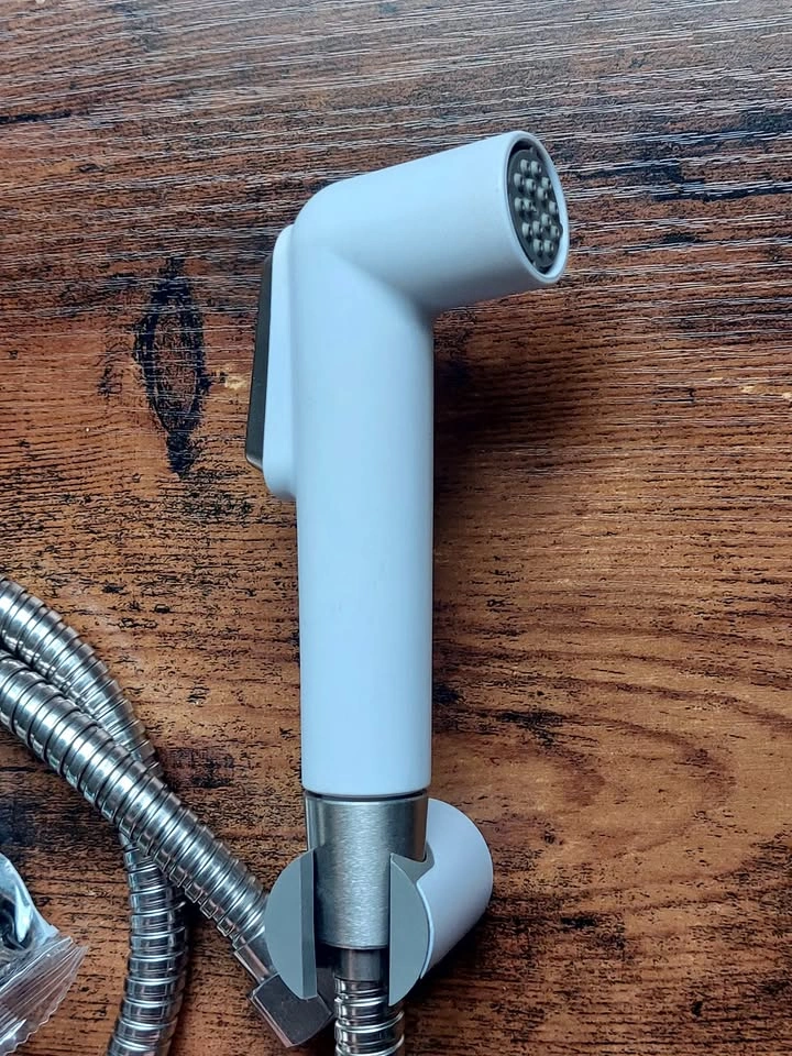 This is a complete handheld bidet shower kit, never used. Includes a ball valve splitter to regulate pressure, a 120cm stainless steel hose, spray handle, two hanging options (screw into wall, or suction onto tile or toilet reservoir), and wrench.