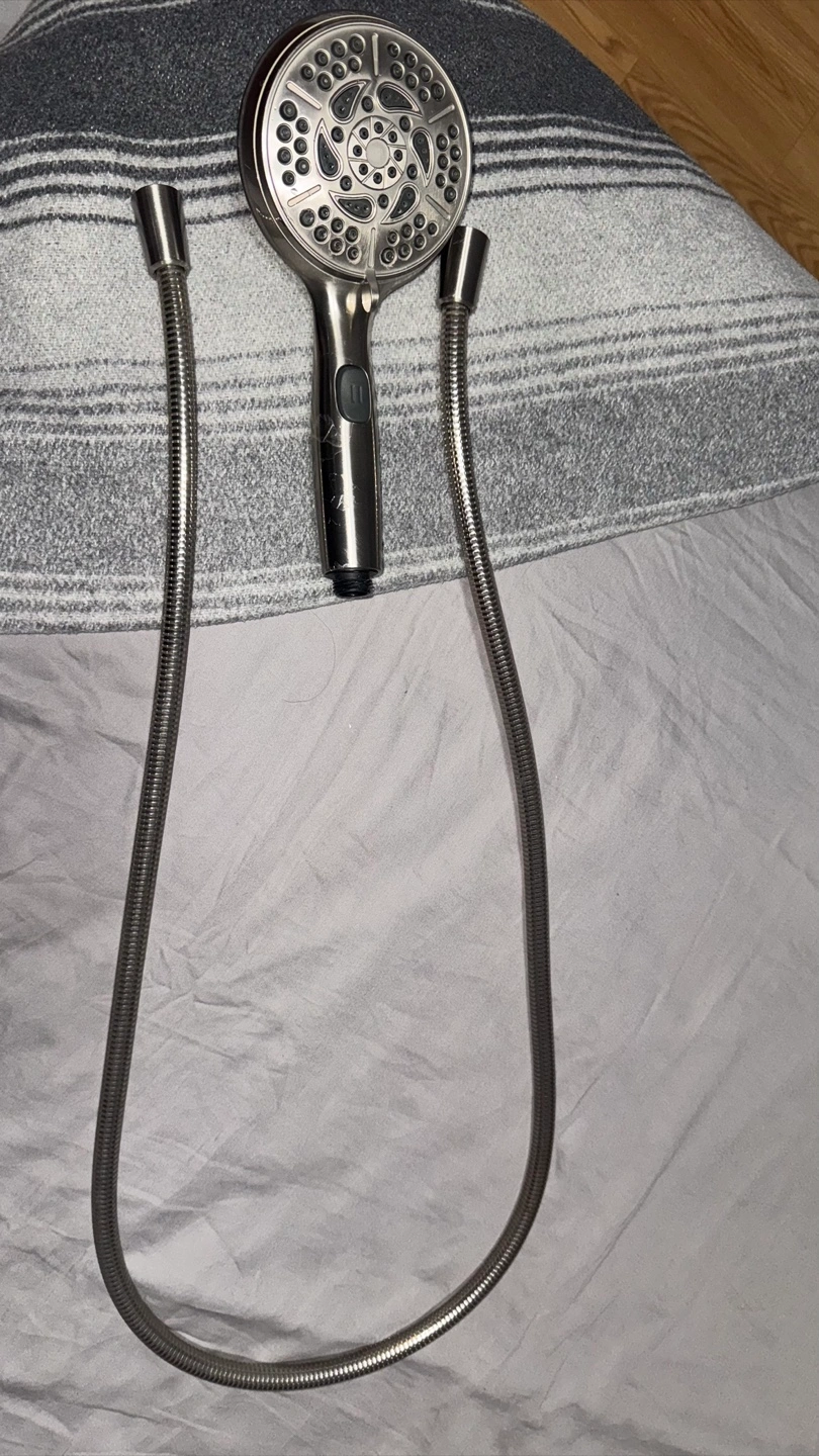 Metal handheld shower head. Features multiple spray settings. Includes a long flexible hose.