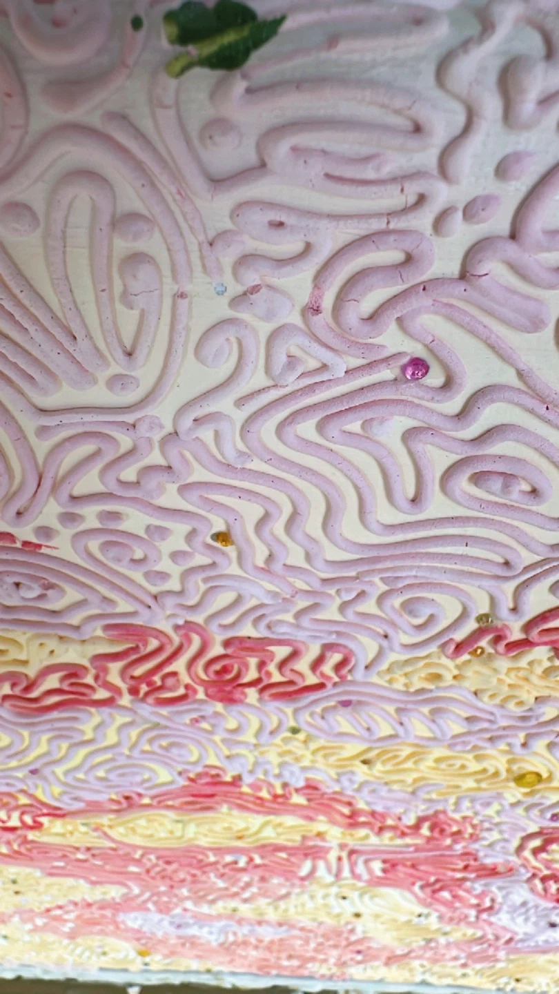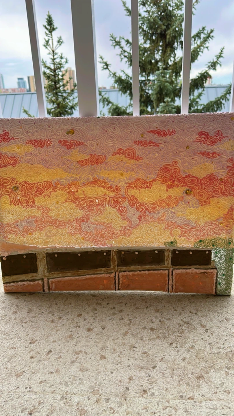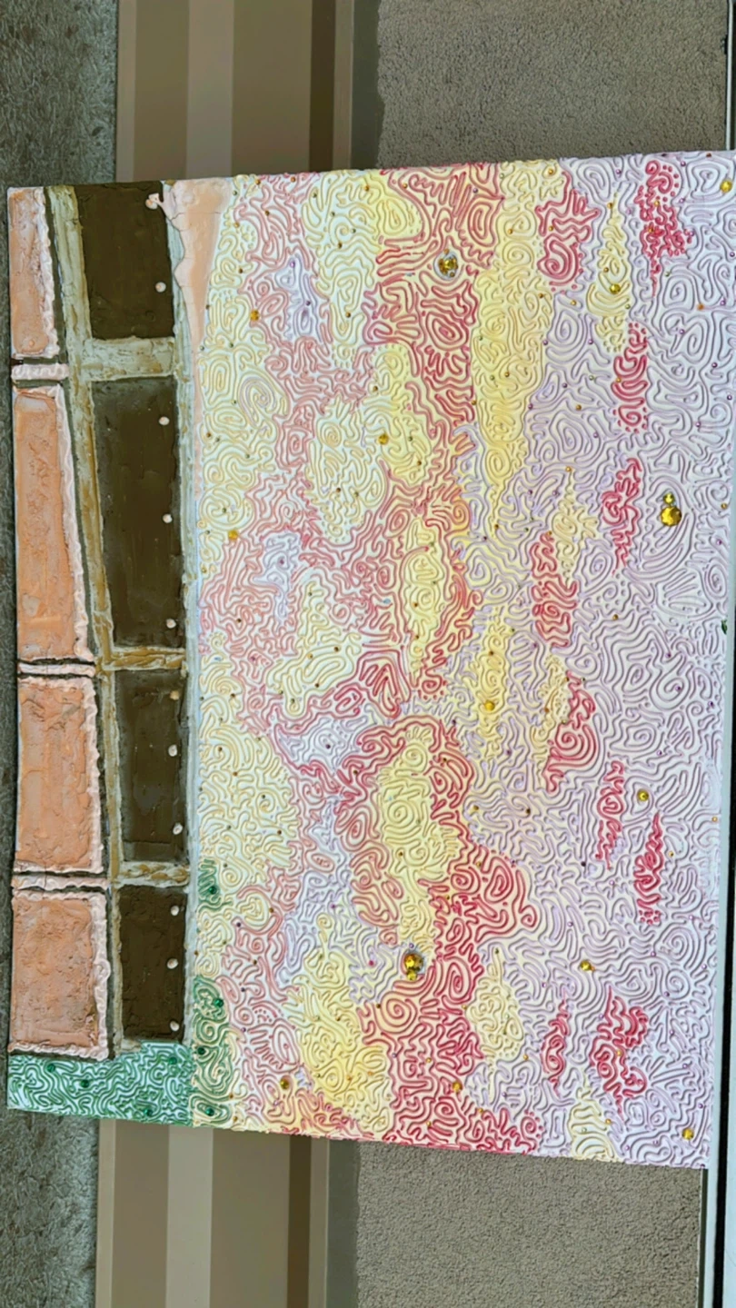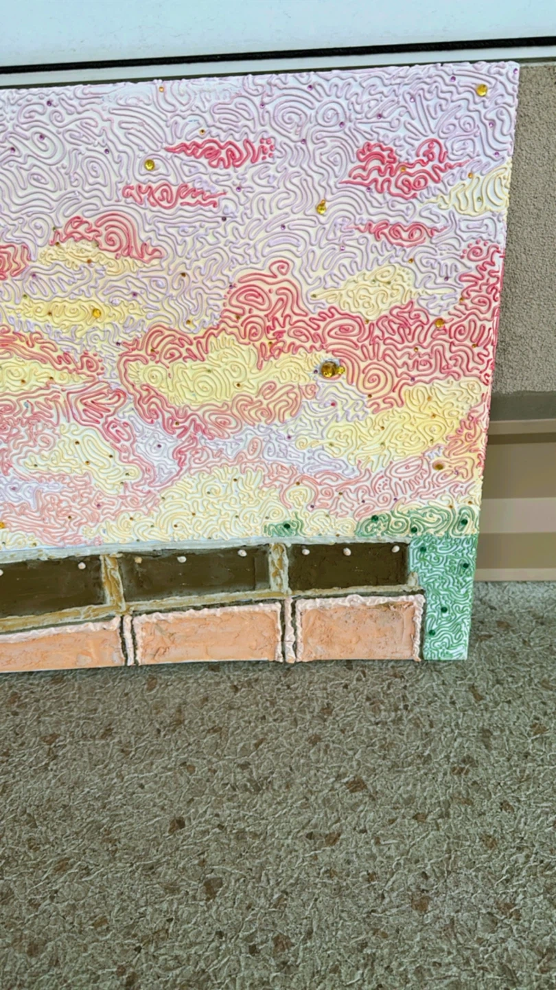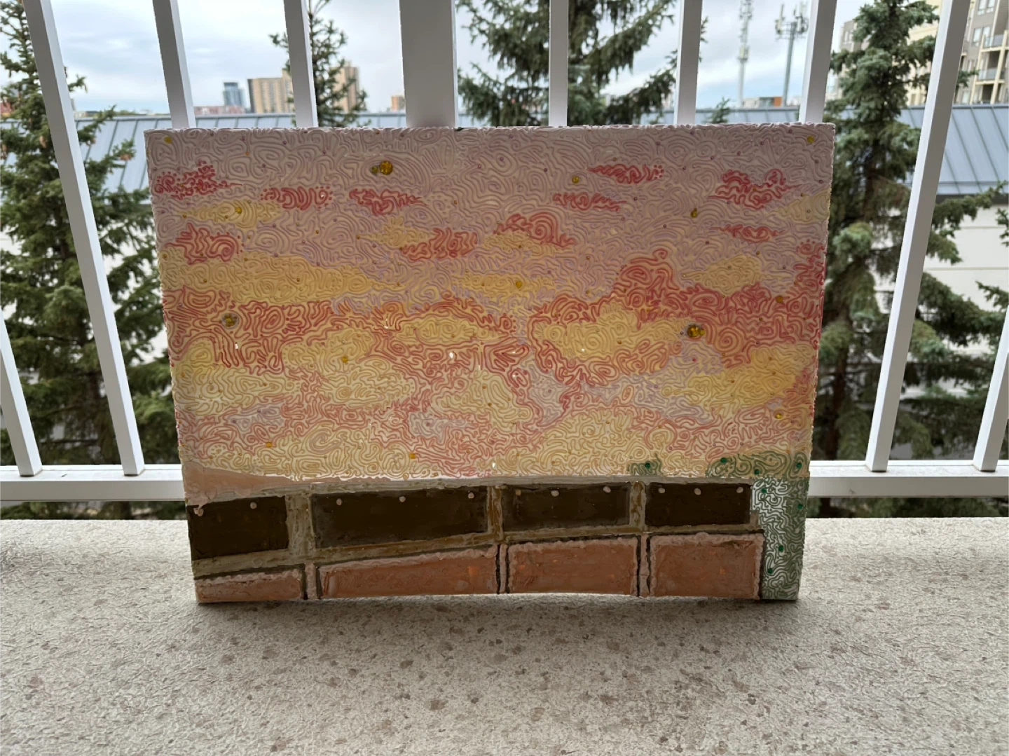 Unique handmade abstract painting with a textured surface. The painting features a blend of soft pastel colours, including pink, yellow, and white, creating a dreamy, cloud-like effect. The lower portion of the painting includes a brick-like design in earthy tones, adding a touch of contrast. A one-of-a-kind piece to brighten any room!