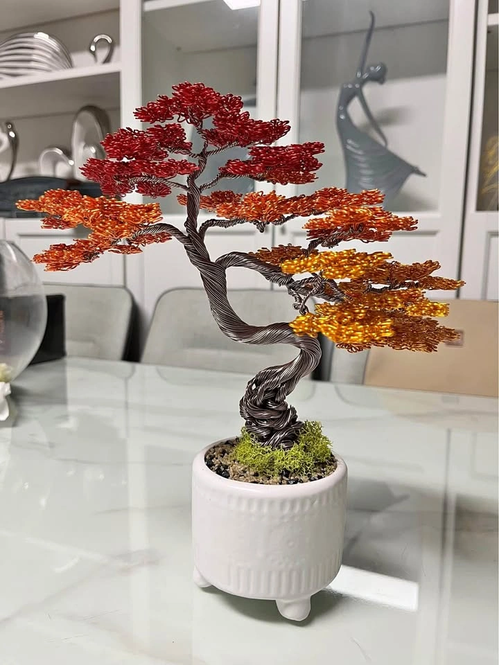 Celebrate the beauty of fall with this handcrafted aluminum wire bonsai tree, inspired by the golden hues and cozy spirit of autumn. Each tree is carefully shaped by hand, featuring warm tones of copper, bronze, and gold wire that capture the essence of changing leaves. ✨ Details: • Handmade using premium aluminum wire • Autumn color palette • Mounted on a white vase • Approx. 10.5 inches tall • Perfect for home, office, or as a seasonal gift • No watering or maintenance required 🍂 Why You’ll Love It: This autumn bonsai brings a warm, rustic charm to any space. Its metallic leaves shimmer beautifully under natural light, creating a peaceful and artistic vibe. A perfect centerpiece for your home this fall — or a heartfelt handmade gift that symbolizes change, strength, and harmony. 💰 Price: $70 📦 For pickup only