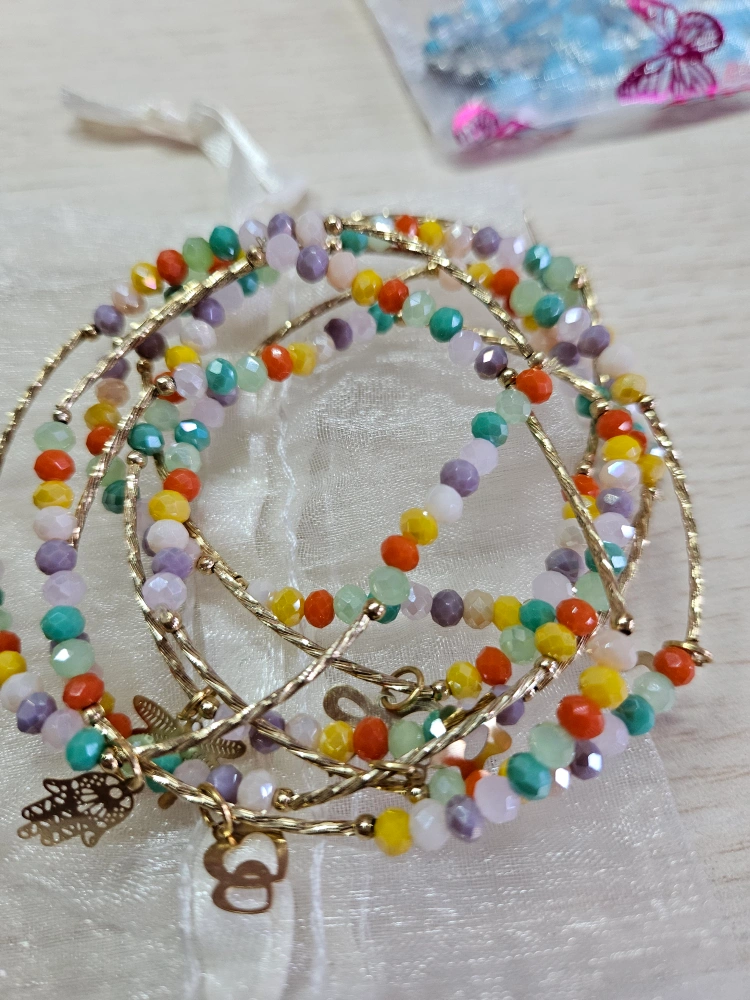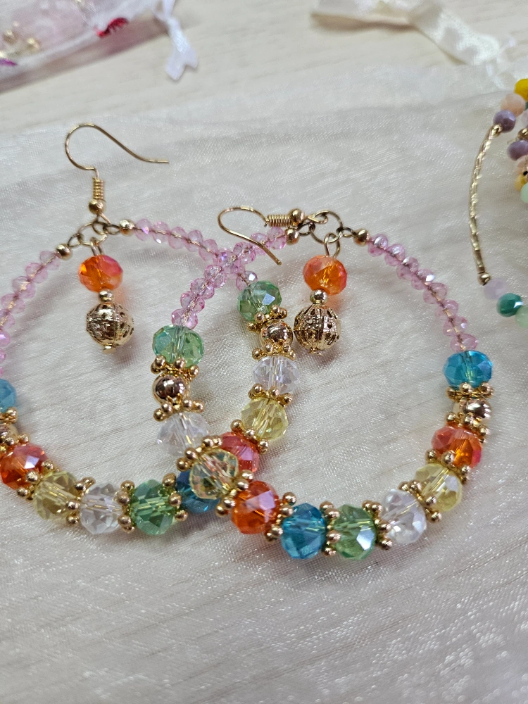 This is a handmade set of beaded bracelet and earrings. They feature colourful beads and gold-tone accents. Perfect for adding a pop of colour to any outfit!