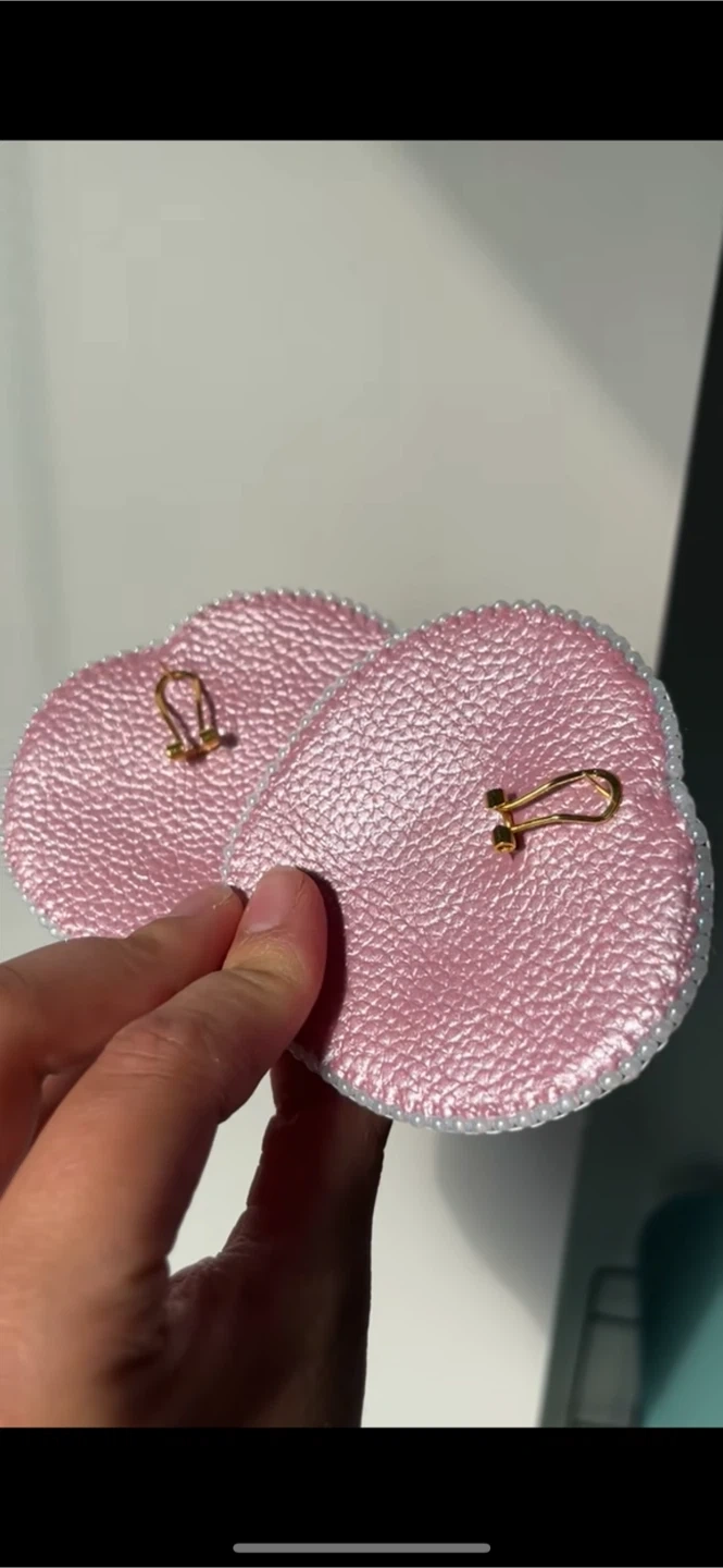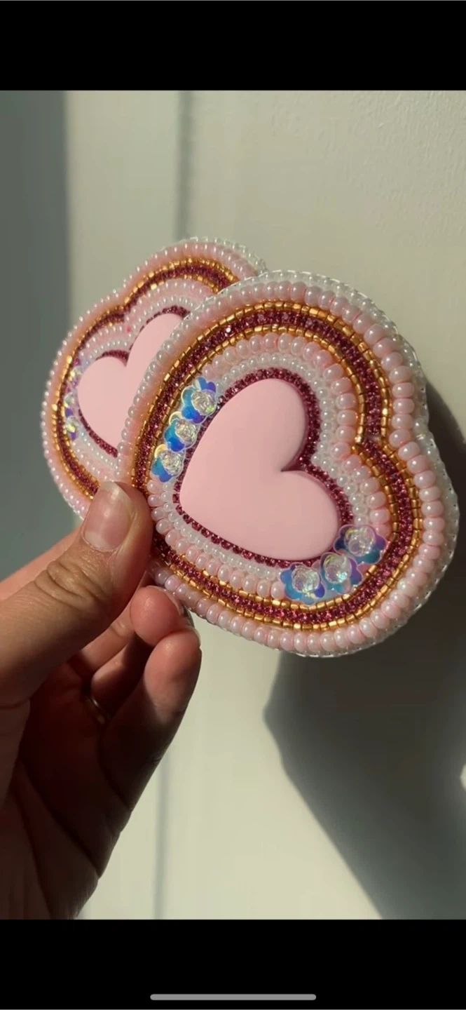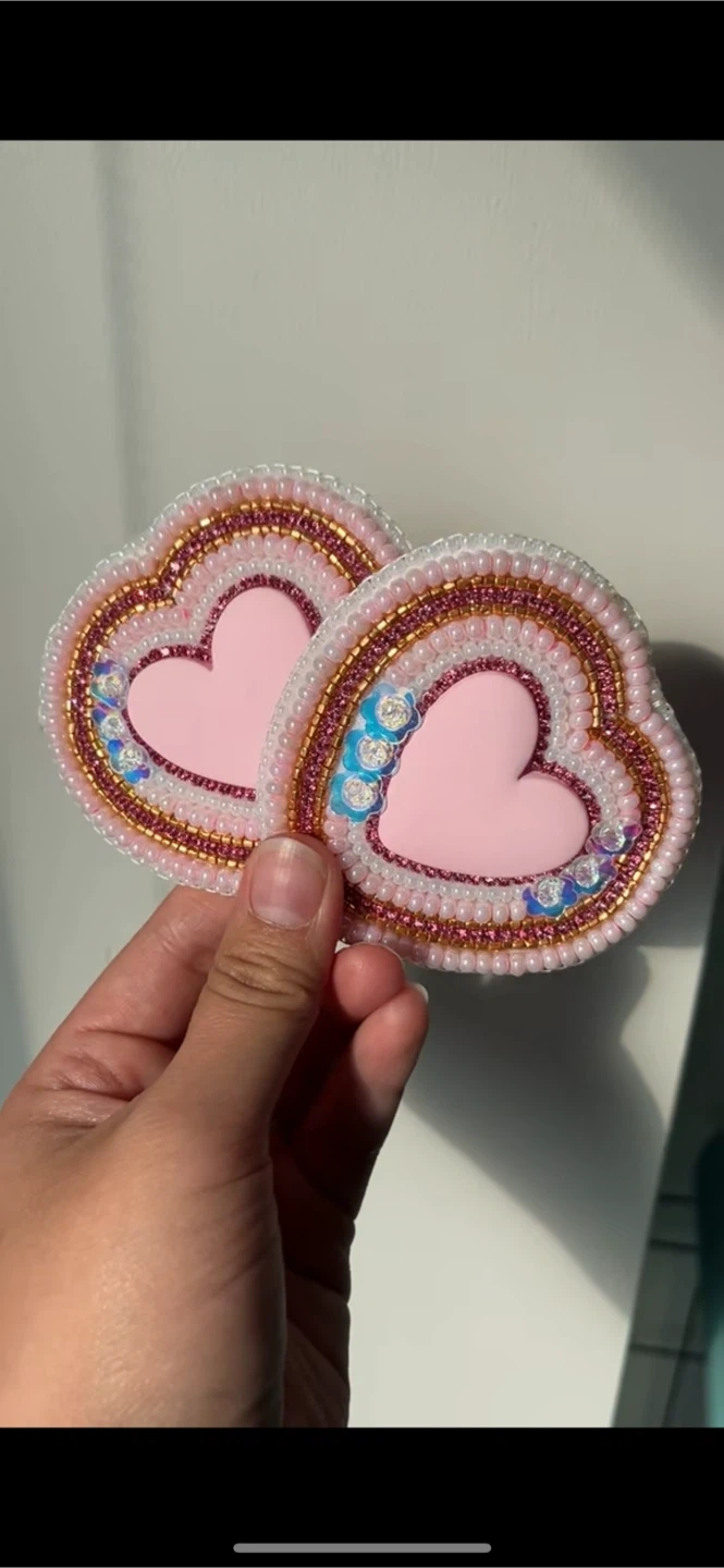 These are a pair of handmade beaded heart earrings. They feature a pink heart centre, surrounded by intricate beadwork in white, gold, and iridescent sequins. The earrings have a rose gold-tone metal backing and clip-on closures.