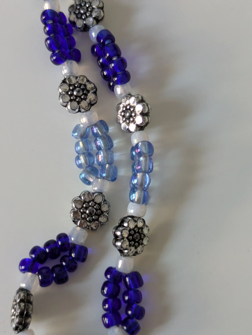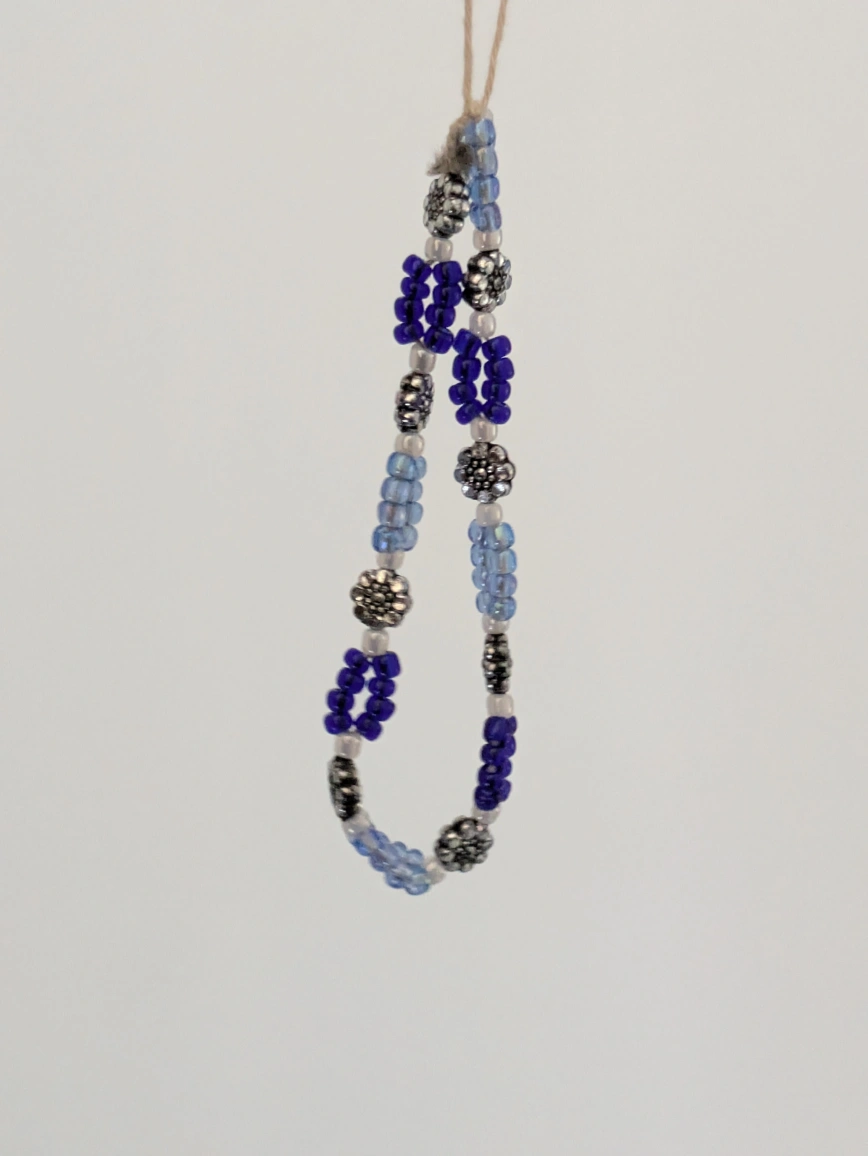 Selling a beautiful handmade beaded necklace. It features a mix of blue and silver beads in various shades and designs. Perfect for adding a unique touch to bags, phones, etc!