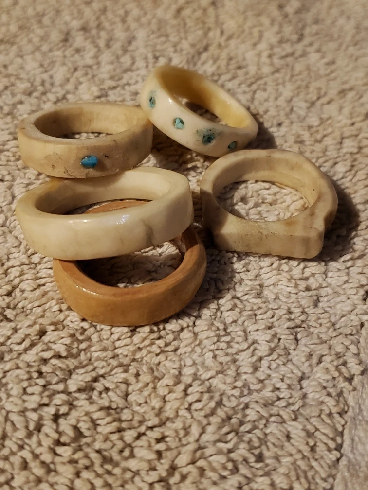 Selling a collection of handmade bone rings. They come in various styles and sizes. INISEX. SIZES 7 TO 10. The rings have a natural, earthy look and feel. Some are decorated with turquoise inlays.