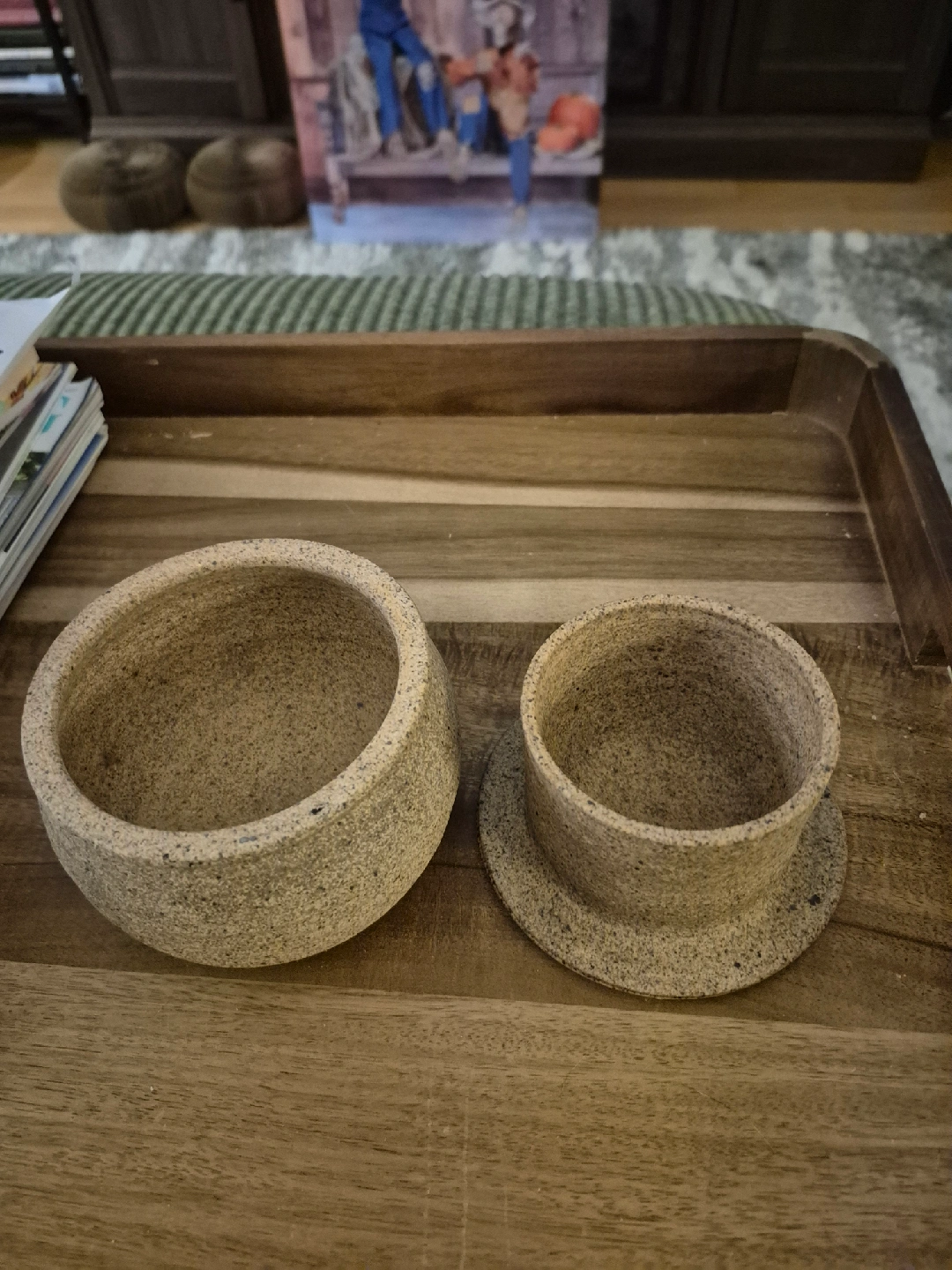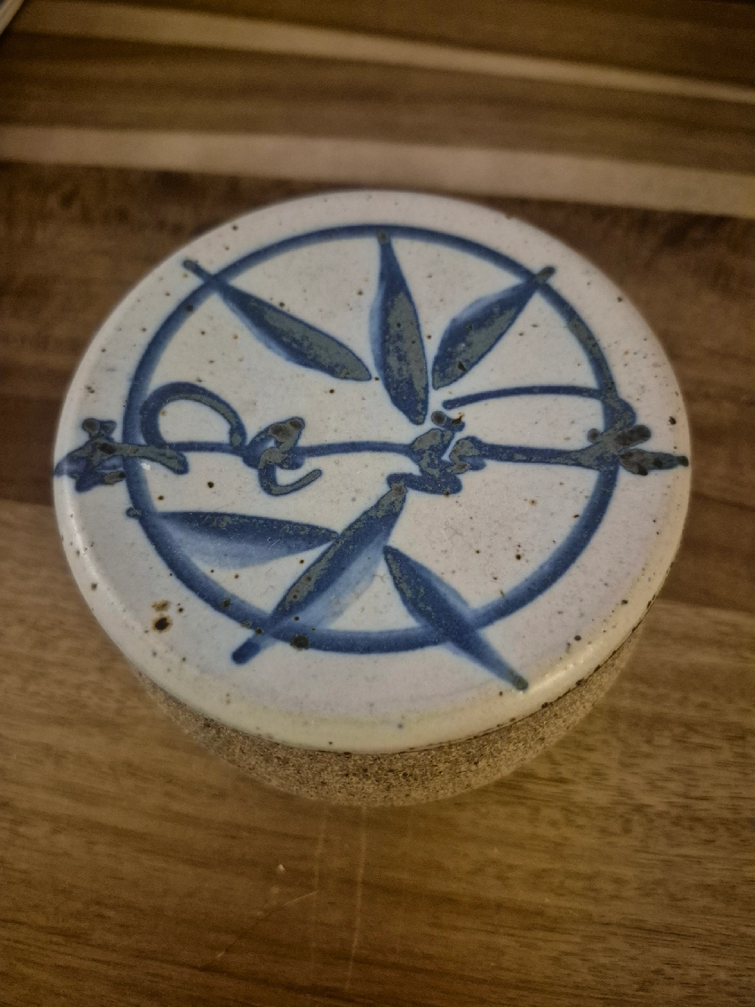 Selling a handmade butter bell/butter crock. They have a unique speckled texture and a neutral colour. It has a lid with a blue and white floral design. Perfect for adding a rustic touch to your home decor!