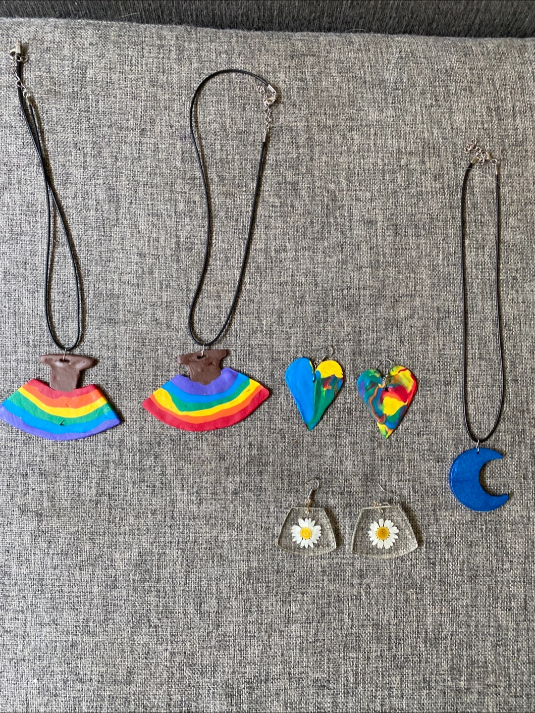 Selling a collection of handmade clay and resin necklaces and earrings. These unique pieces feature colourful designs, including rainbow, heart, and moon pendants, plus daisy earrings. Perfect for adding a personal touch to any outfit!