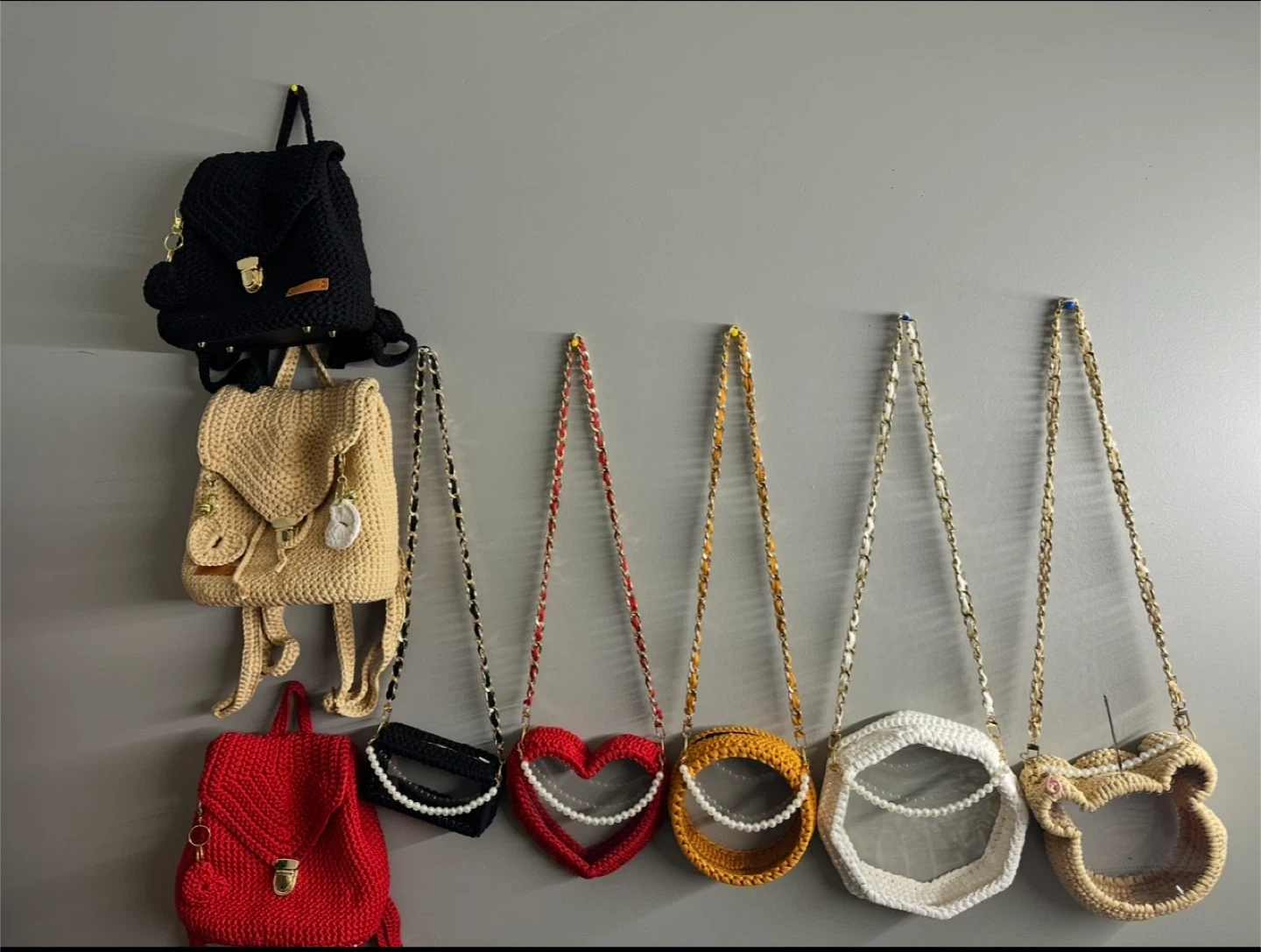 I have a selection of adorable handmade crochet backpacks and purses available! They come in various colours and designs, including backpacks in black, beige, and red, as well as unique purses in heart, circle, and other shapes. All lovingly crafted!