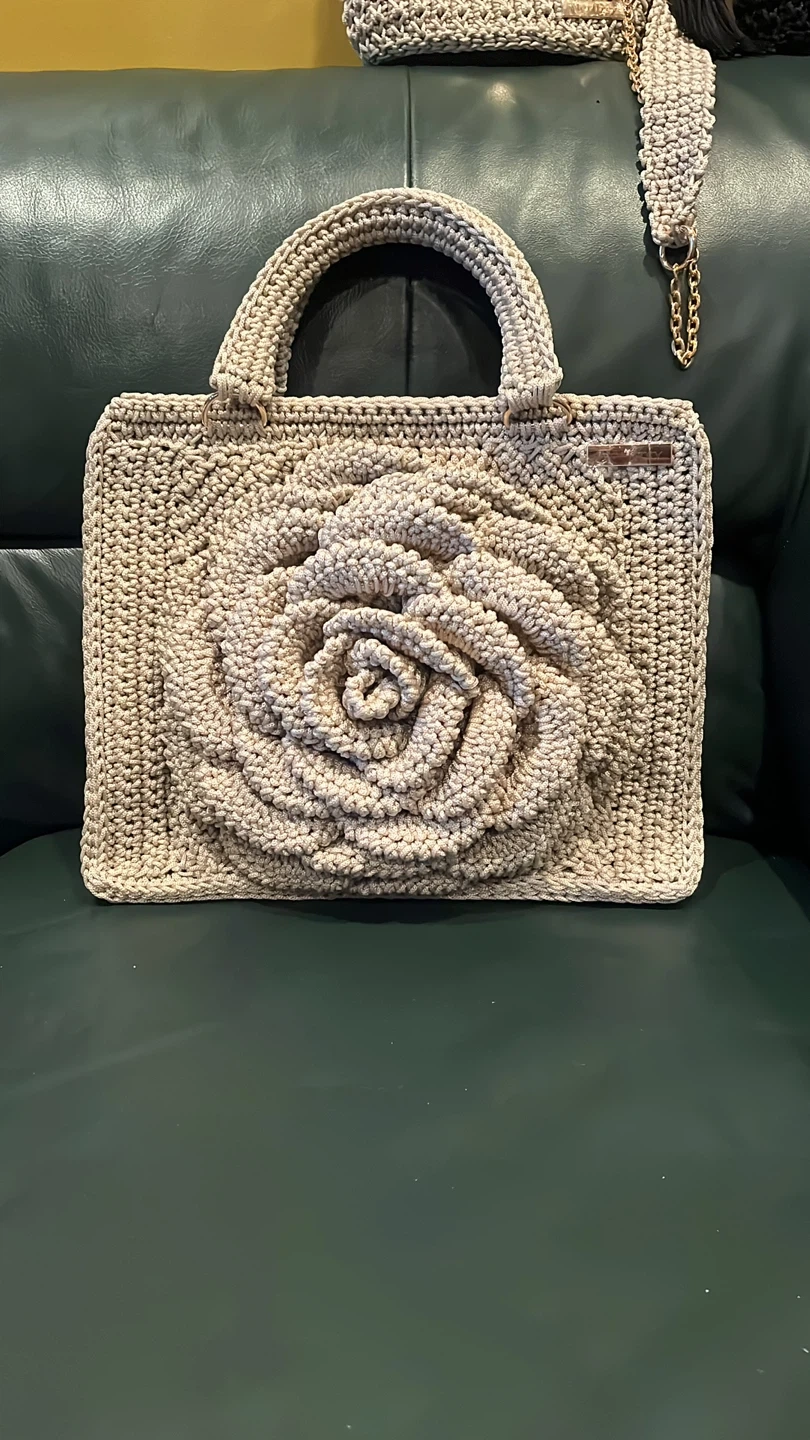 Check out this beautiful handmade crochet handbag! It features a lovely rose design on the front. The bag comes with a shoulder strap with chain detailing. Perfect for adding a unique touch to your outfit!