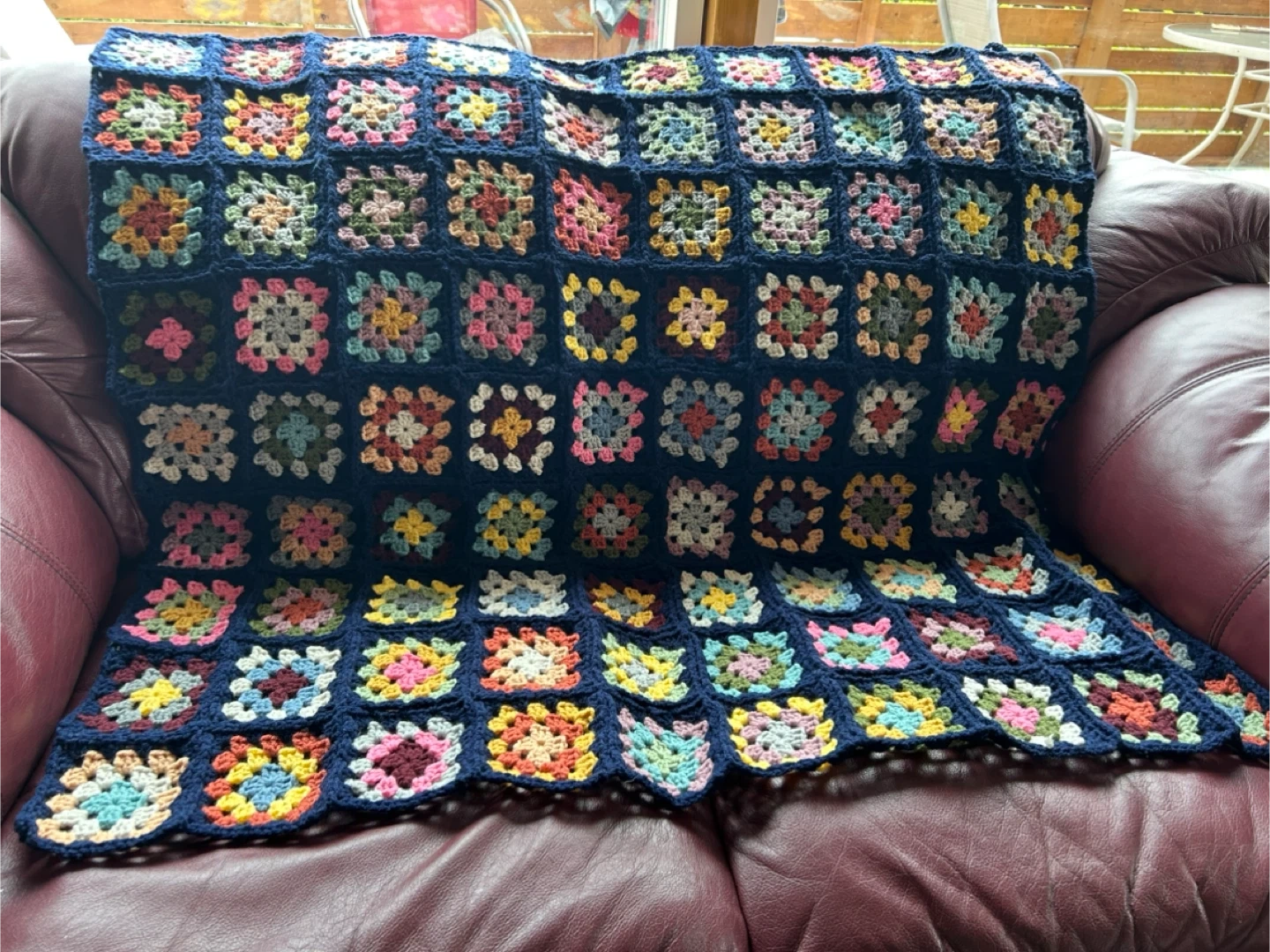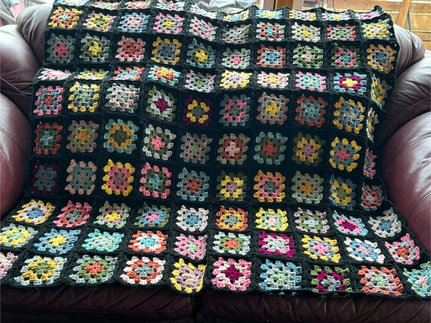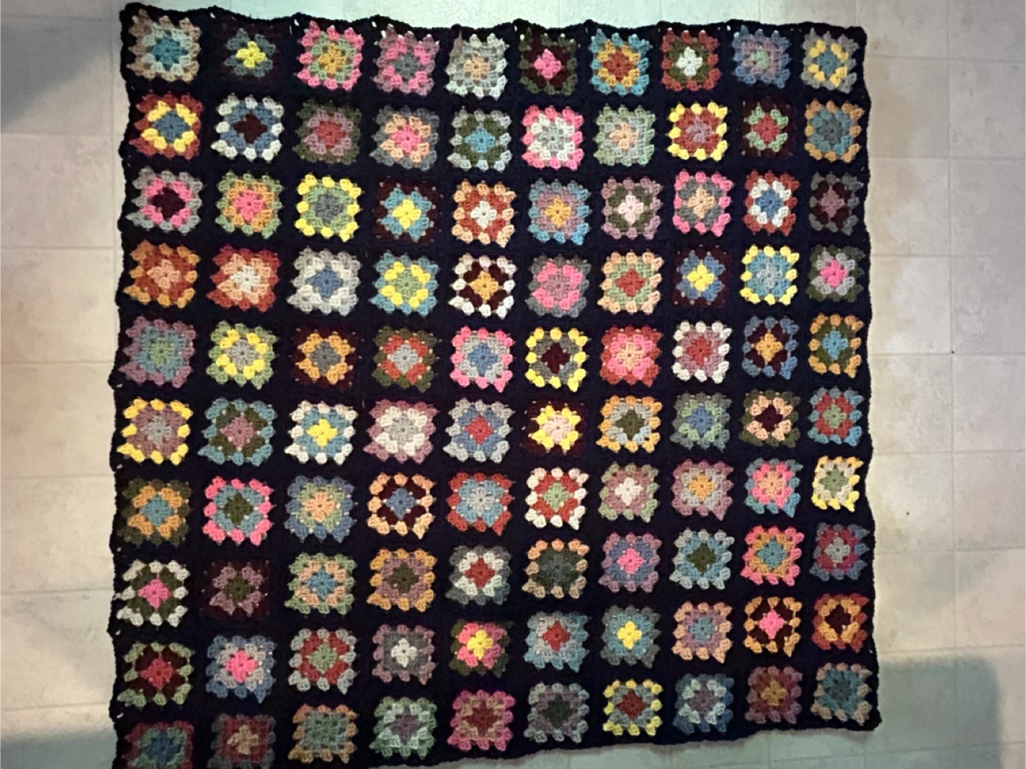 Crochet blanket with a granny square design. Acrylic yarn. Size: approx 4’x4’