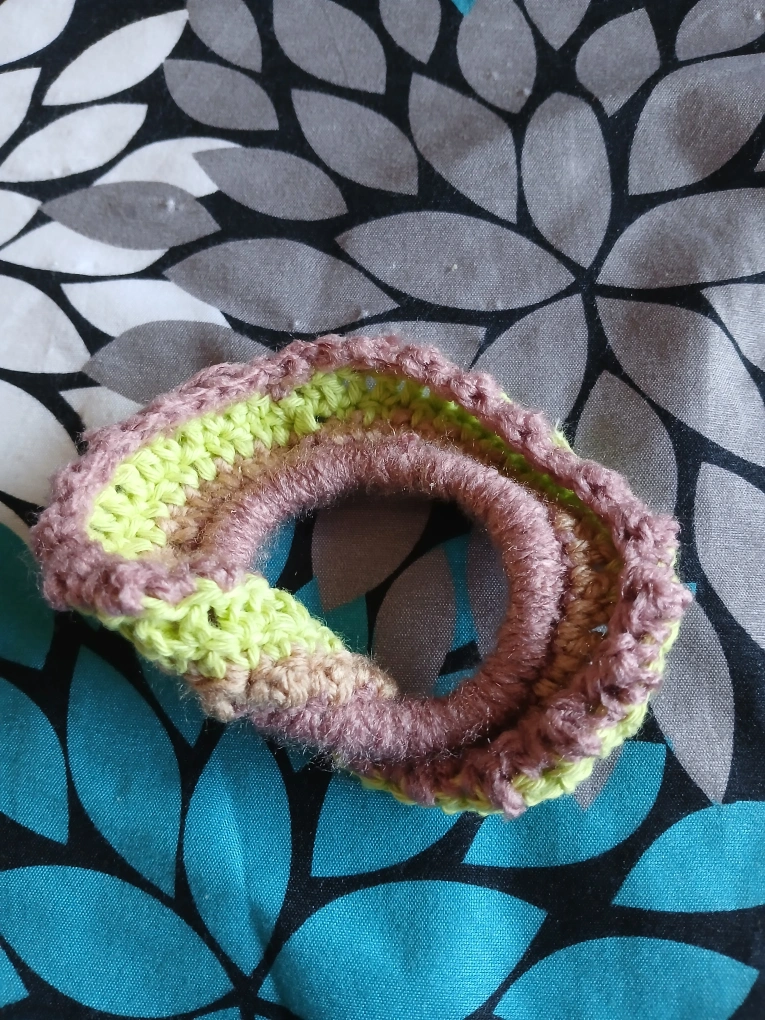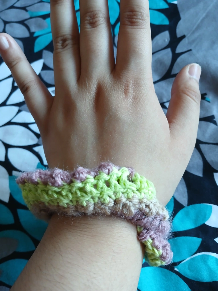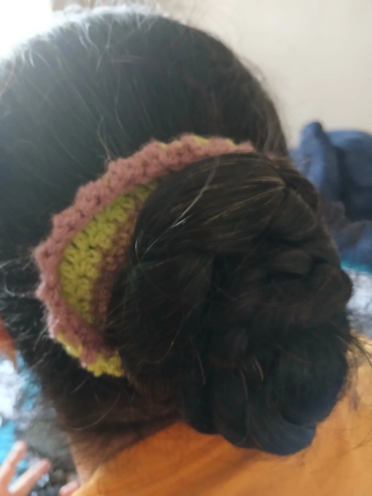 Check out this adorable handmade crochet hair scrunchie! It's a unique accessory, perfect for adding a touch of charm to any hairstyle. The colours are a lovely combination of green and mauve, making it a fun and stylish addition to your collection