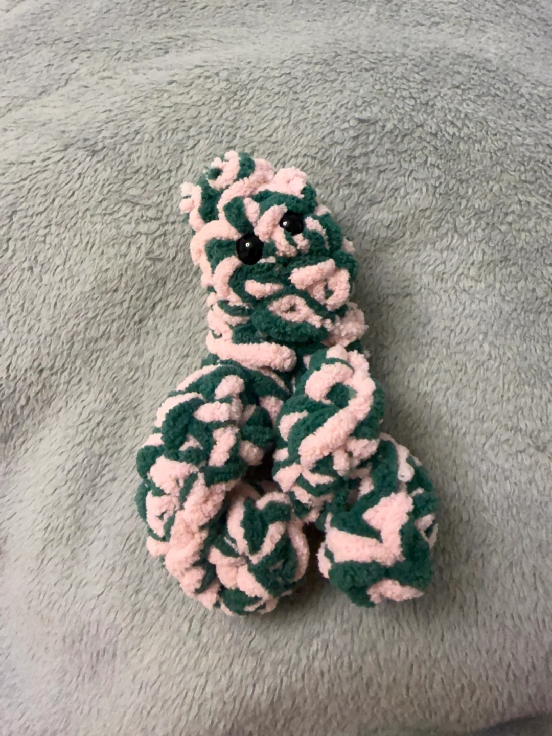 I'm selling a cute, handmade crochet plushie! It's made with soft, plush yarn in a green and pink pattern and I did my best. I’m an absolute beginner so it might look bad but I took 2 hours of my time! I hope you like it. Note: The safety eyes/eyes can be a choking hazard so message me if you’re buying this for a child or a kid that understands it’s dangerous or a gift for a friend. This is especially dangerous for a child that bites things out of curiosity.