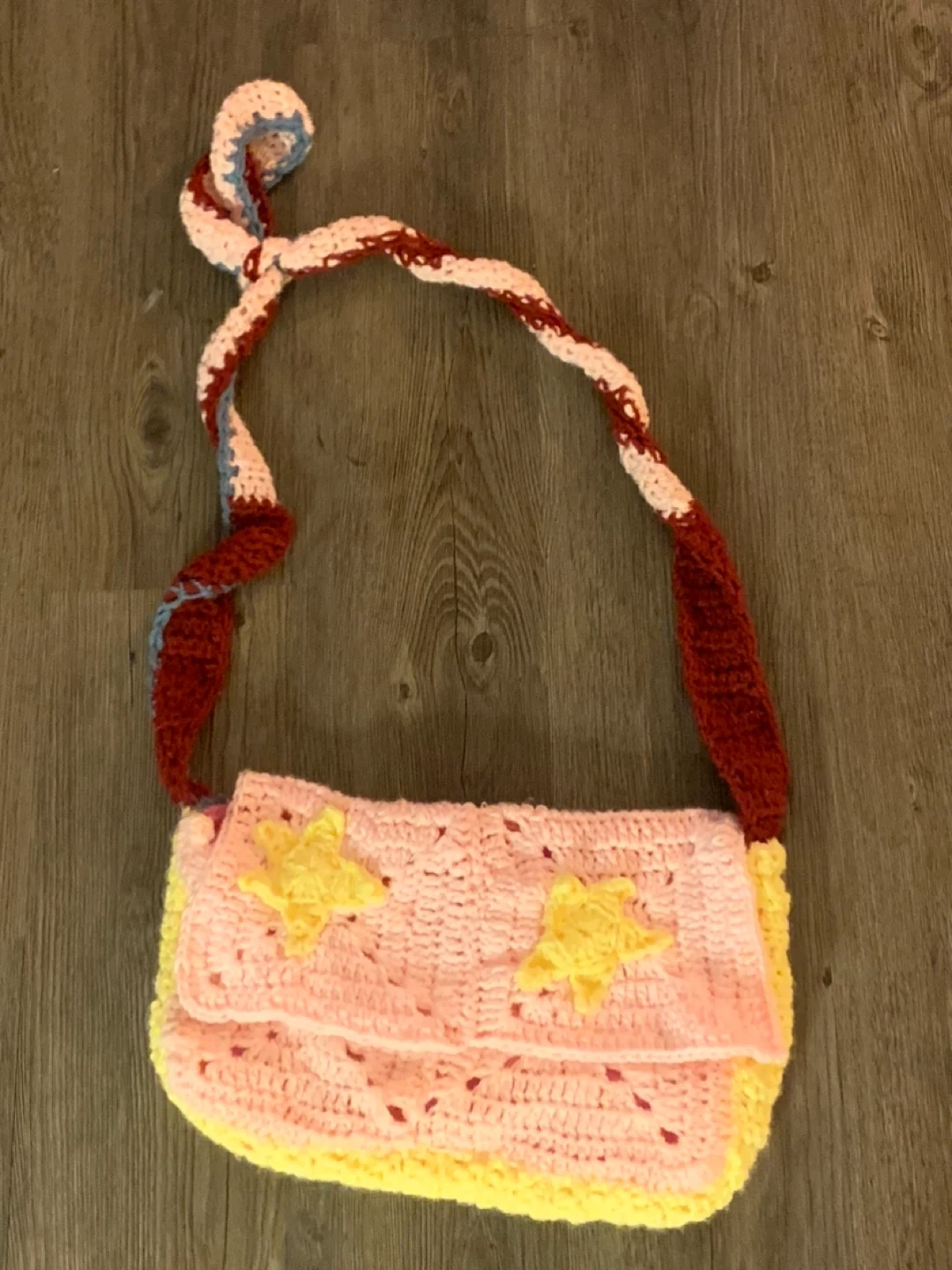 Check out this unique handmade crochet shoulder bag! It features a colourful design with pink, yellow, and red accents. The bag is adorned with cute yellow star appliques. Perfect for adding a touch of whimsy to any outfit! Strap is adjustable to tie to any fitting.