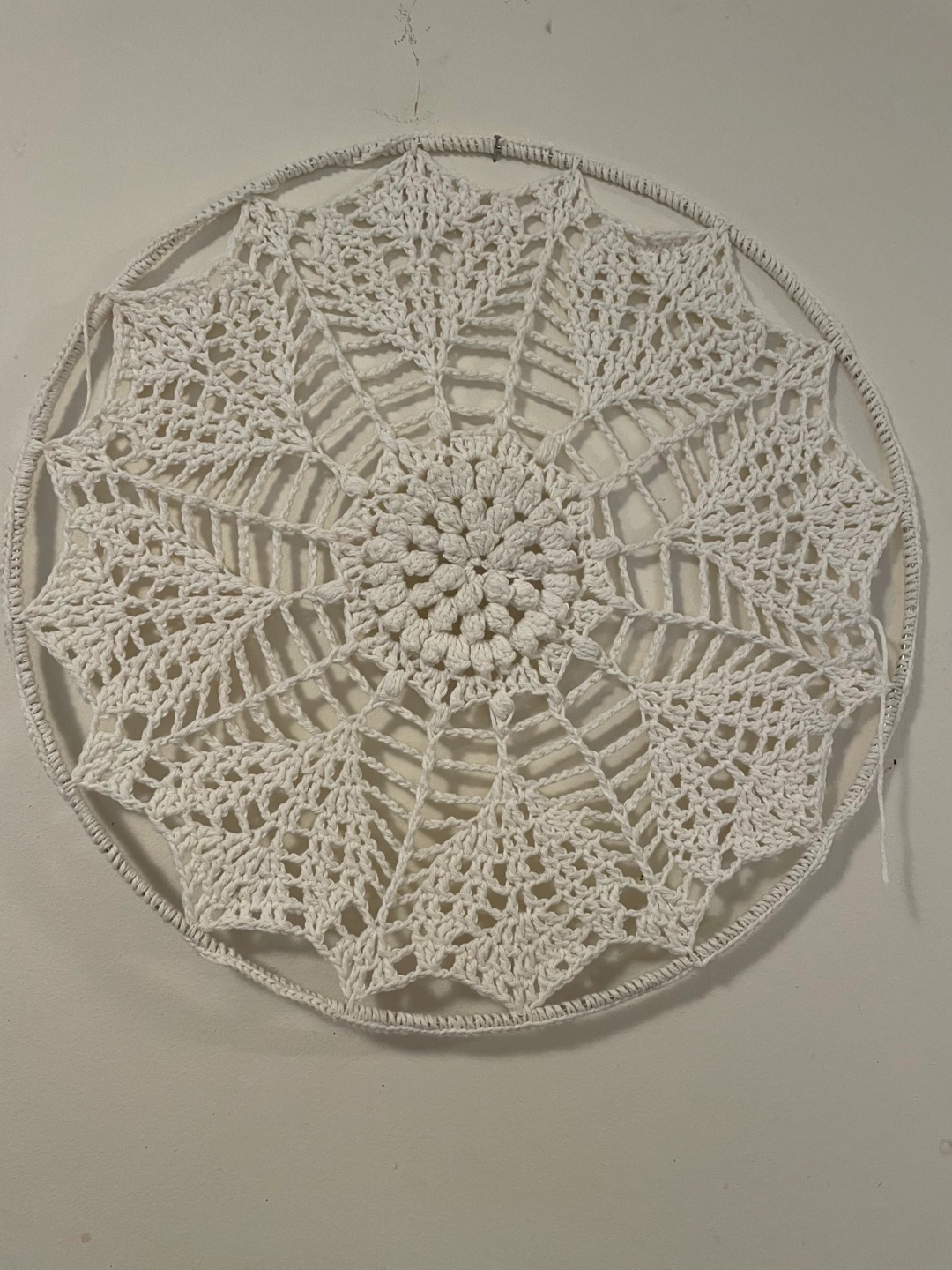 Unique off-white crochet mandala wall décor. Intricate design, circular shape. Adds a touch of bohemian charm to any room. Perfect for adding texture and visual interest. KOZ4ALRM KREATIONS