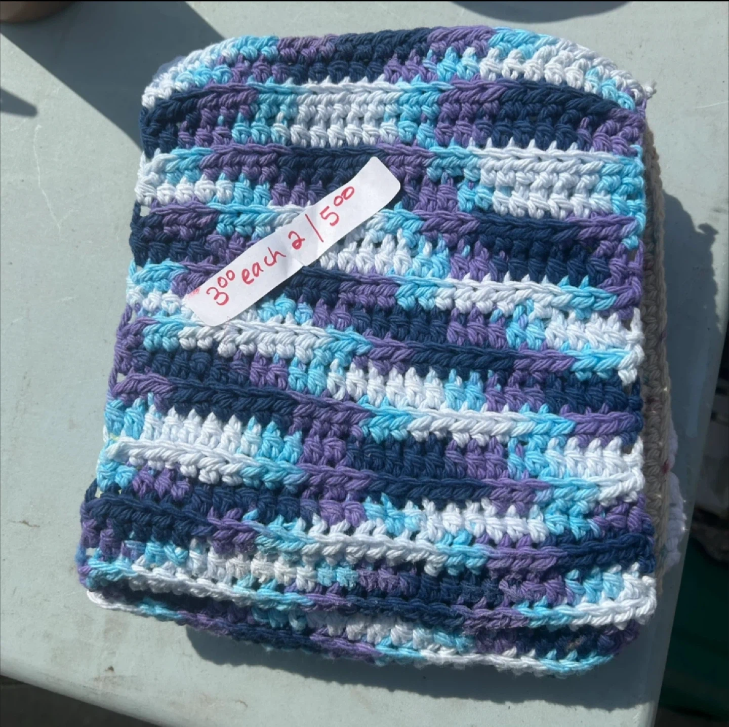 Selling a cute handmade crocheted bag! It features a lovely pattern with shades of blue, purple, and white. It's in great condition and ready for a new home. Get it for $3 or two for $5!