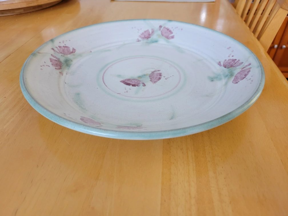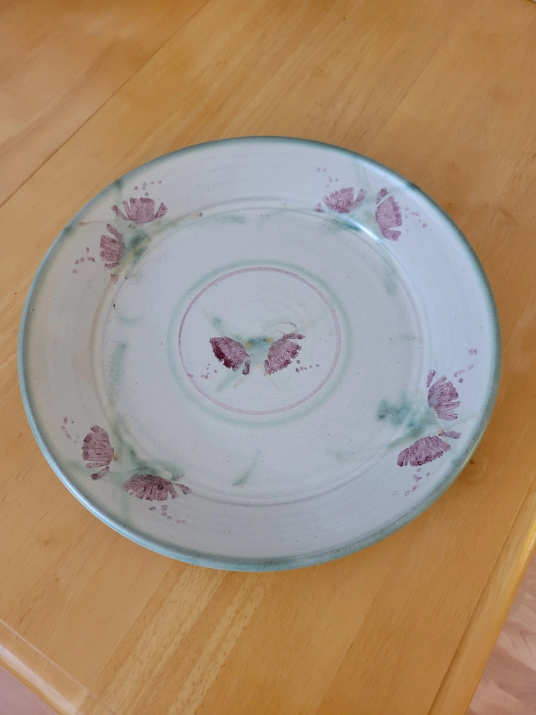 Selling a handmade decorative plate. It has a unique floral design with purple and green accents. The plate is in good condition and would make a lovely addition to any home. Perfect for display or light use