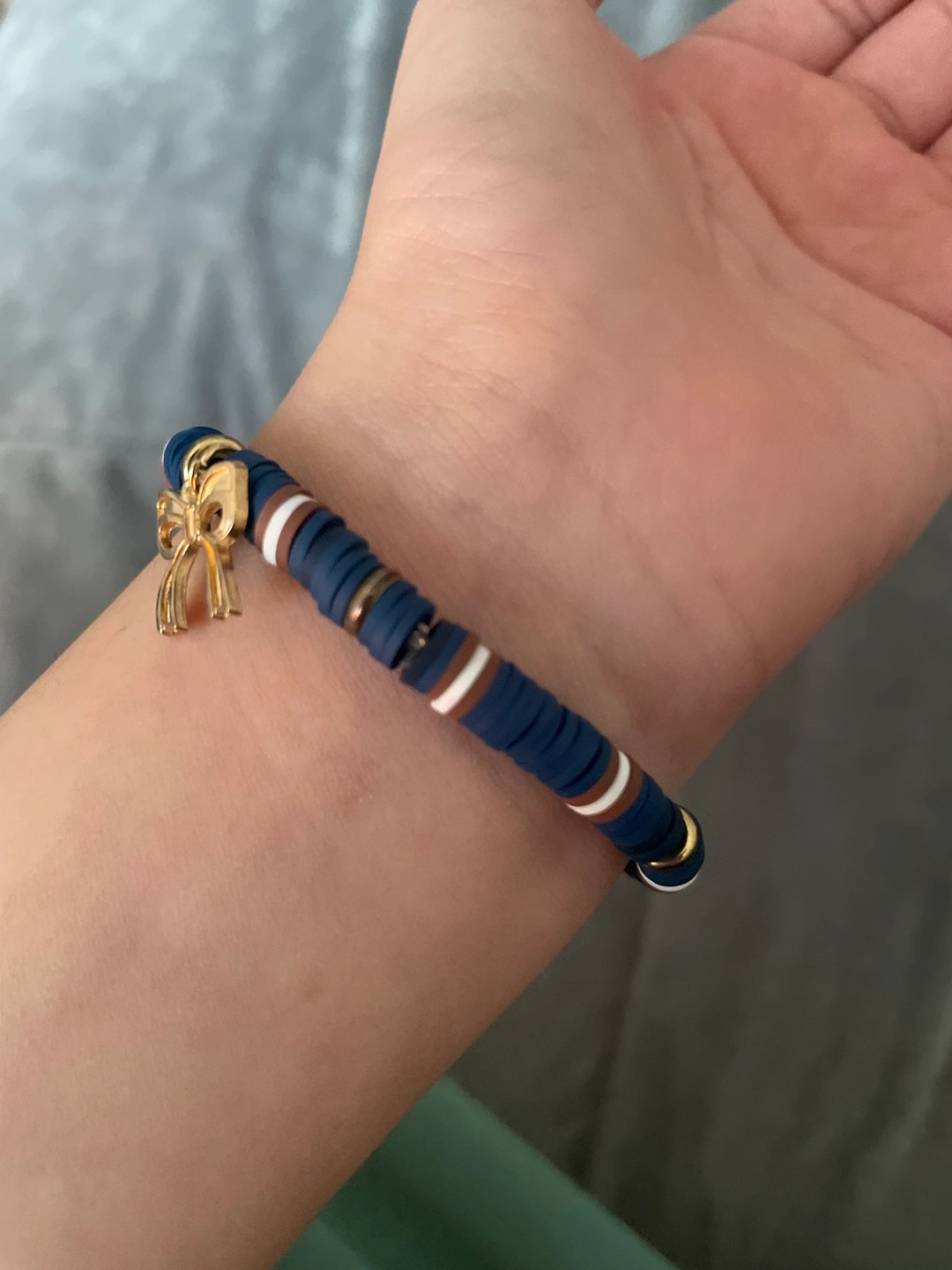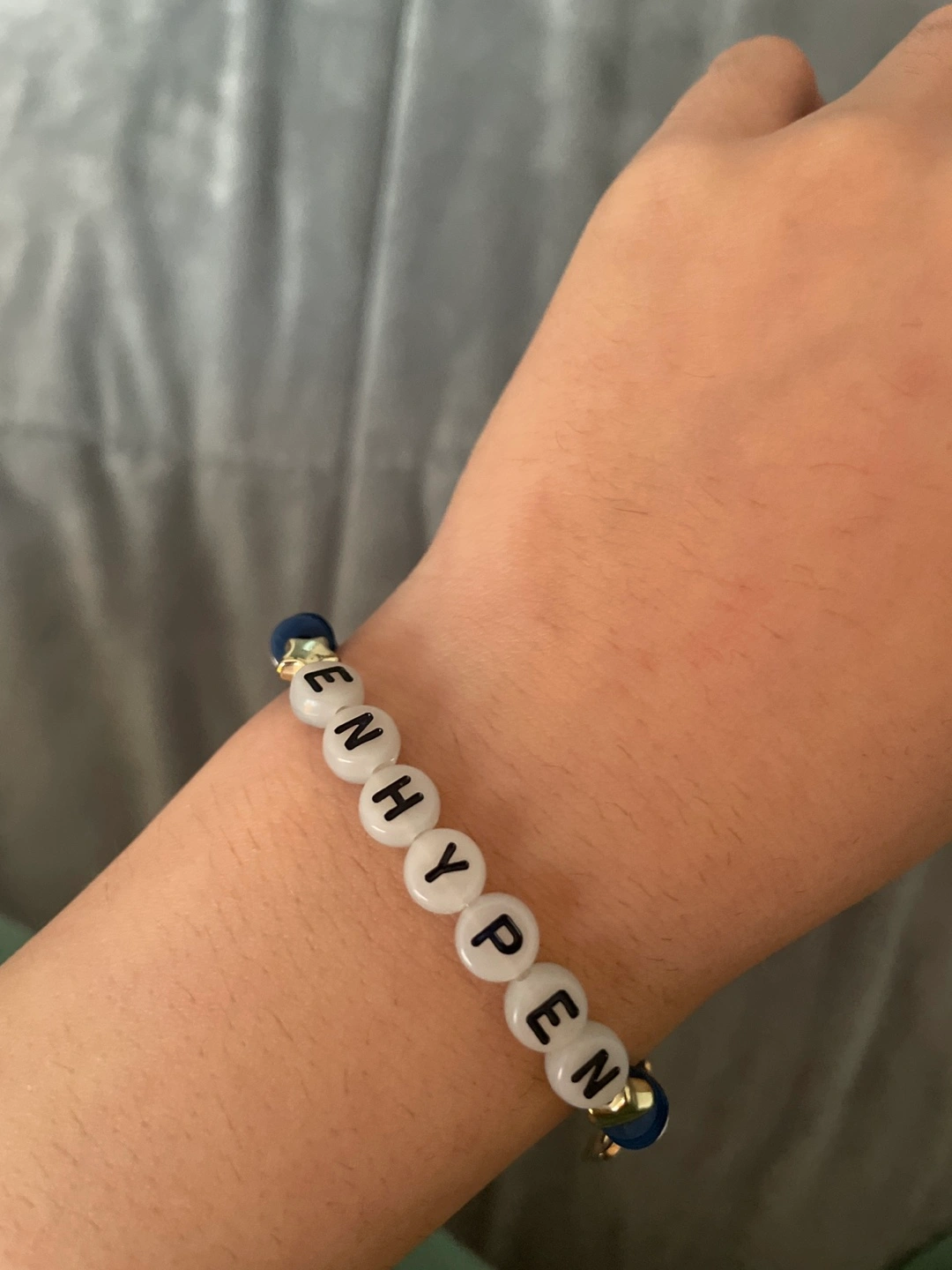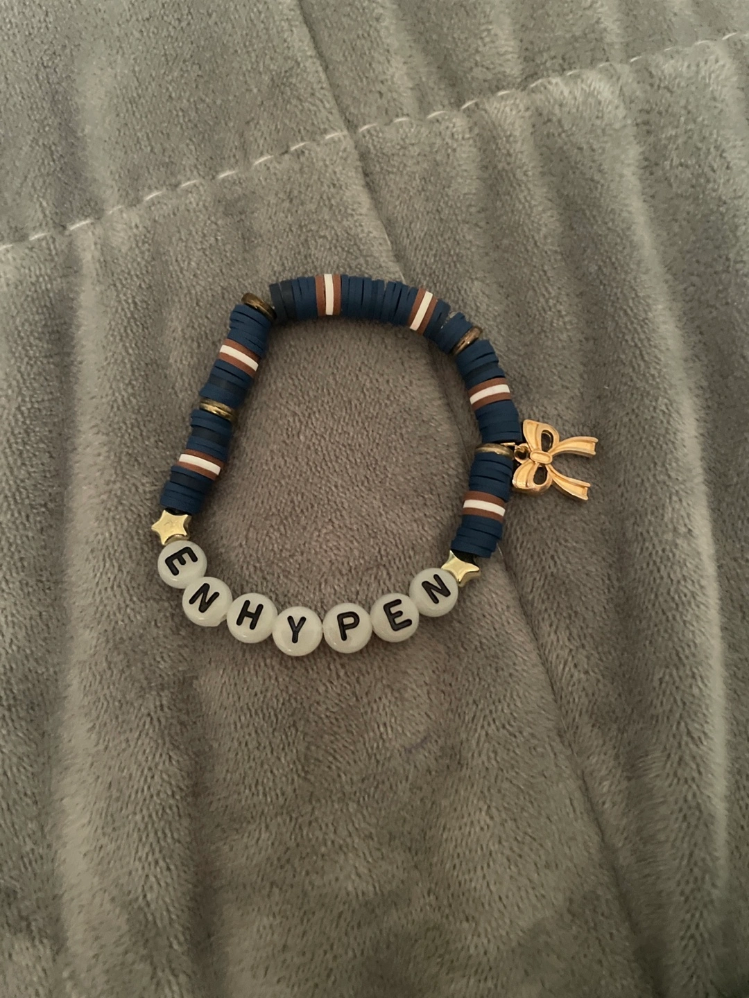 Selling a handmade ENHYPEN bracelet! It features blue and brown disc beads, letter beads spelling out "ENHYPEN", and a cute gold bow charm. Perfect for any ENHYPEN fan!