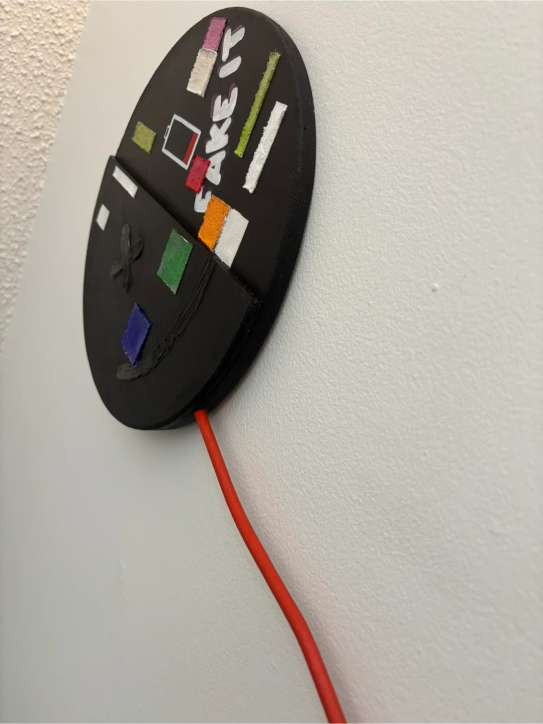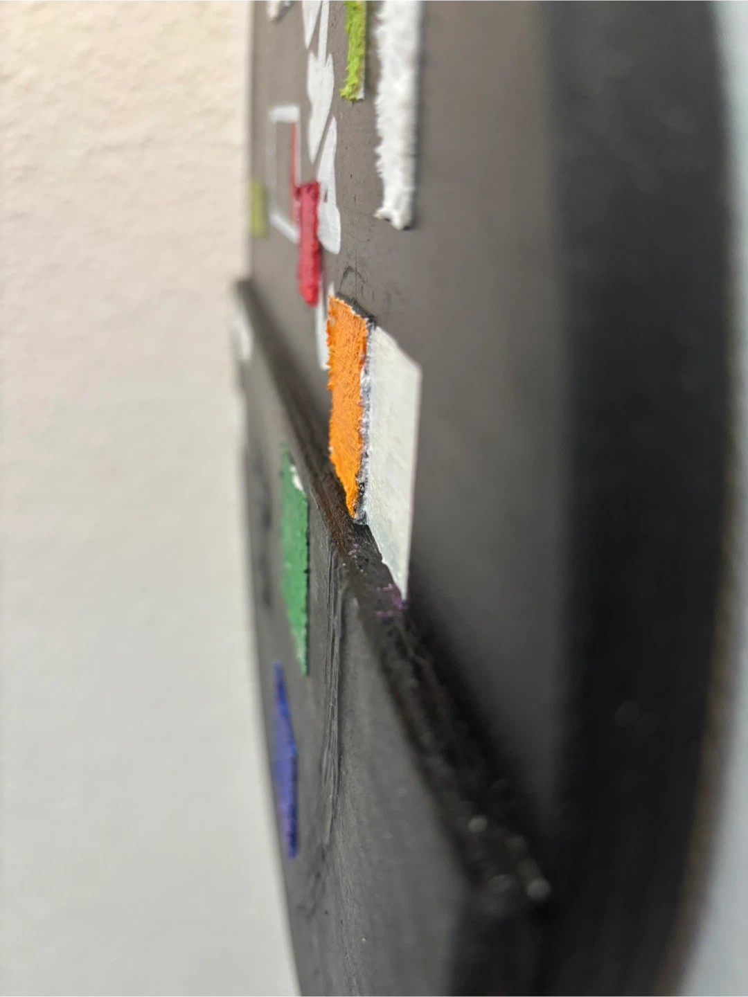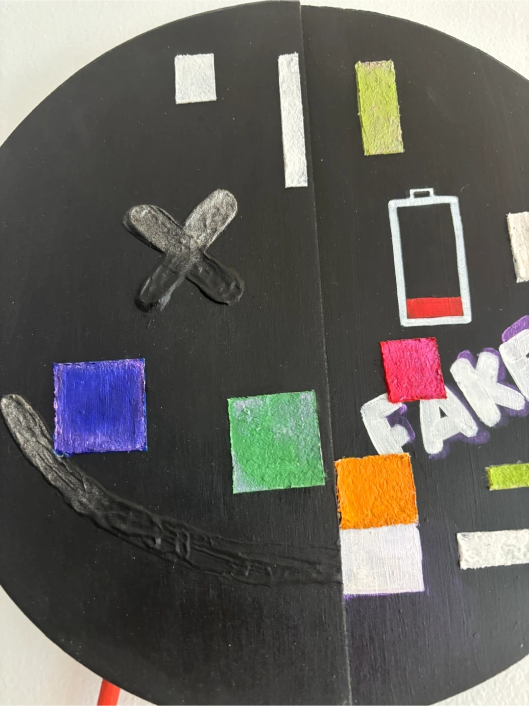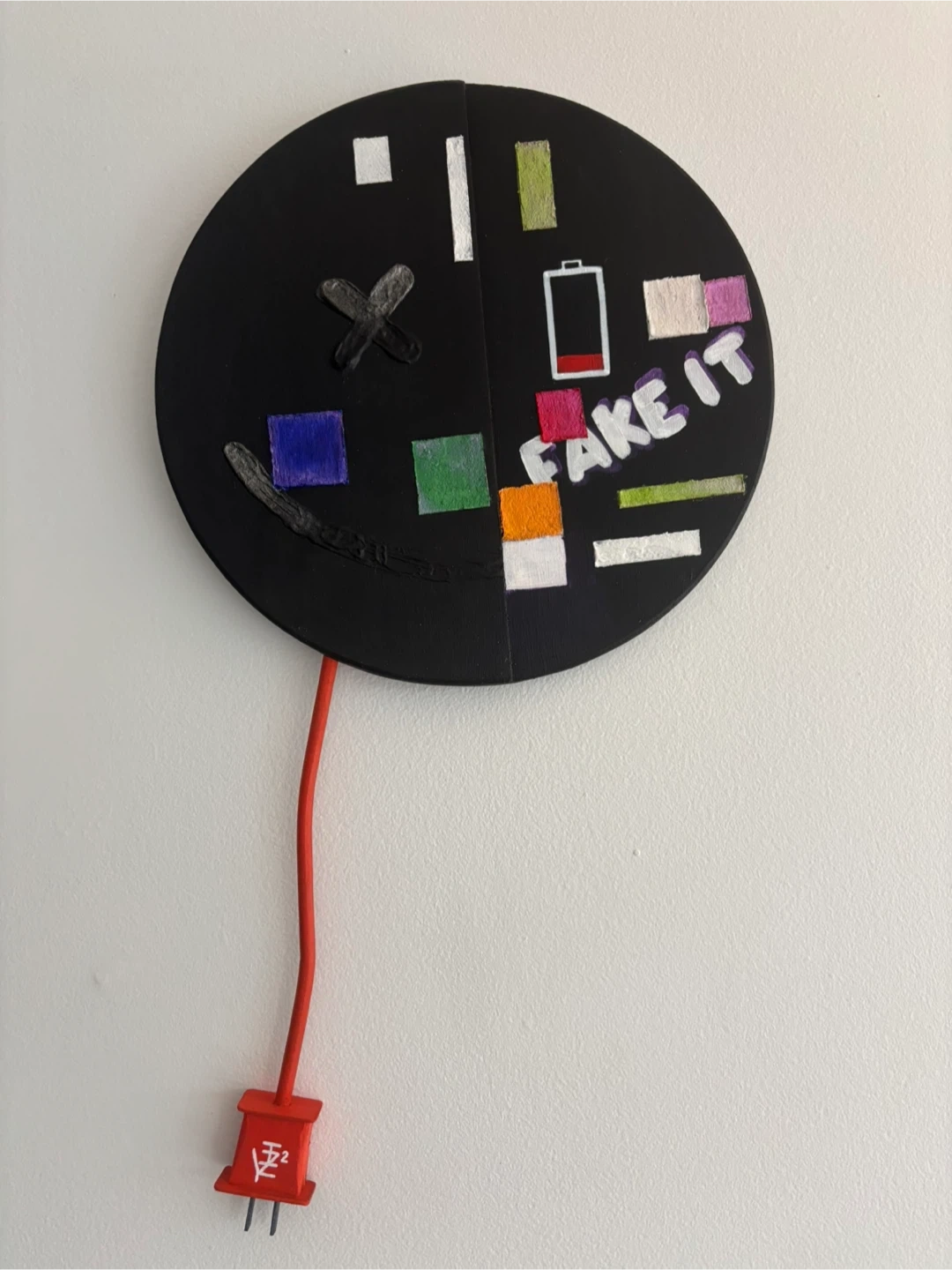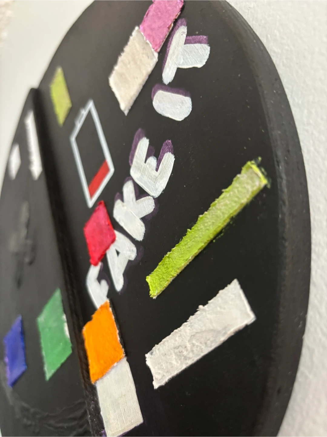 Unique handmade wall art with a whimsical design! It features colourful painted details and a playful 'Fake It' motif. A fun and quirky addition to any room! Acrylic on plywood 12” diameter