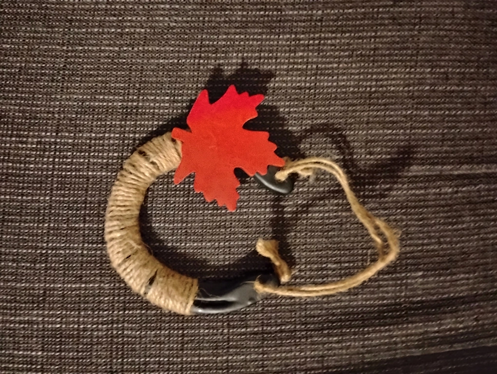 Add a touch of rustic country charm with this handmade horse shoe art It features a cute maple leaf accent and a natural twine wrap. Perfect for adding a cozy, western canadian vibe to your home $15