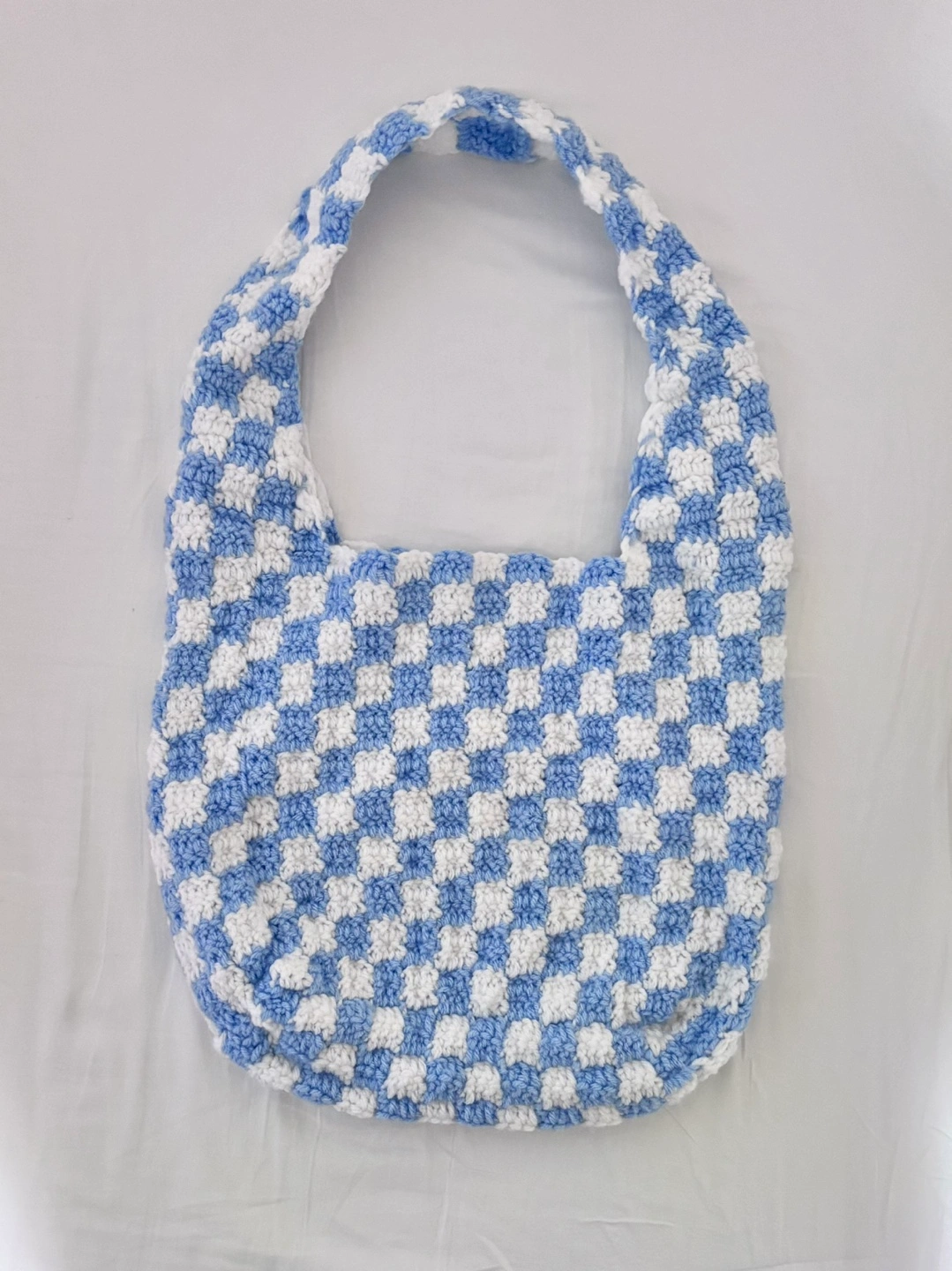 - handmade crocheted large bag - baby blue and white checkered pattern - lightweight & roomy cash only
