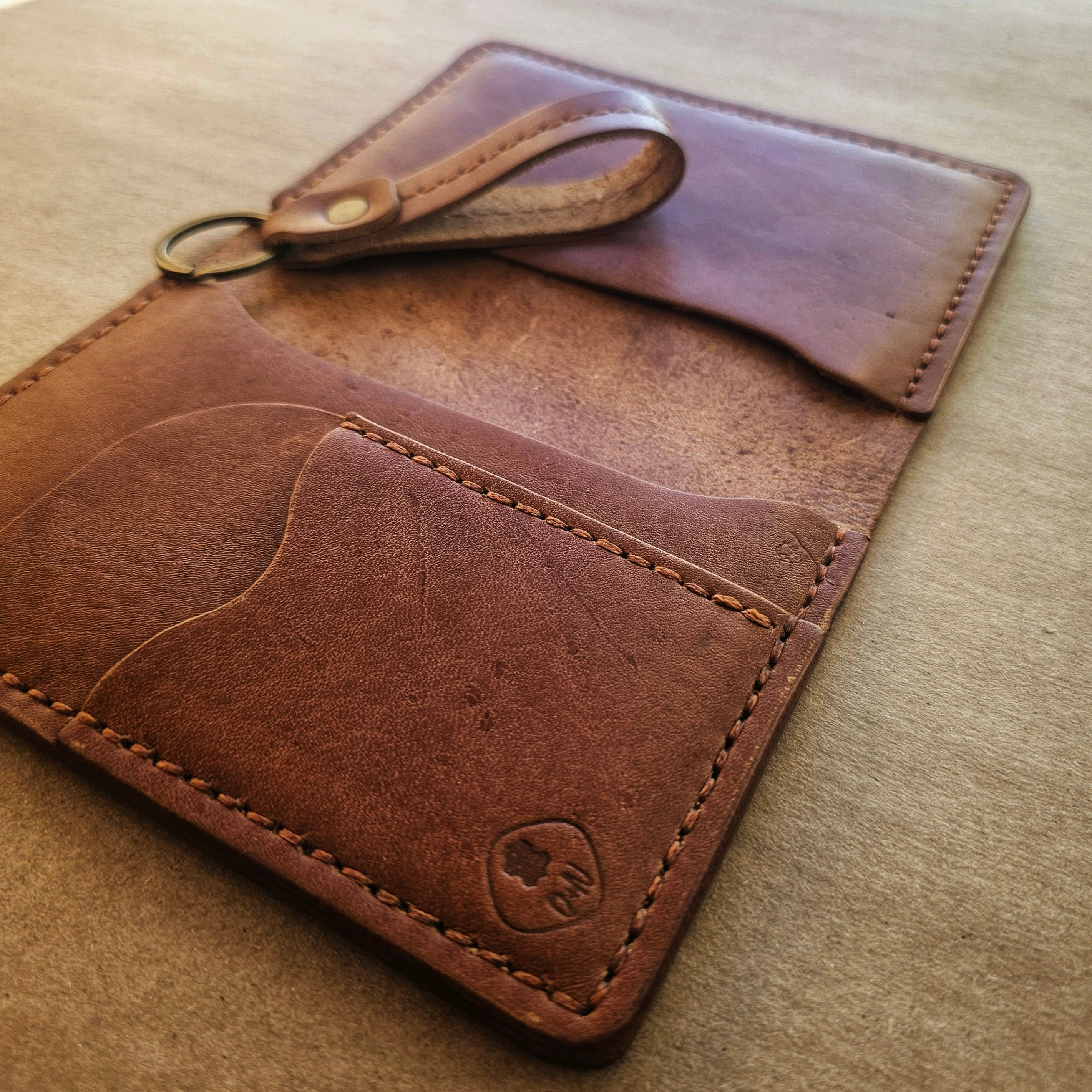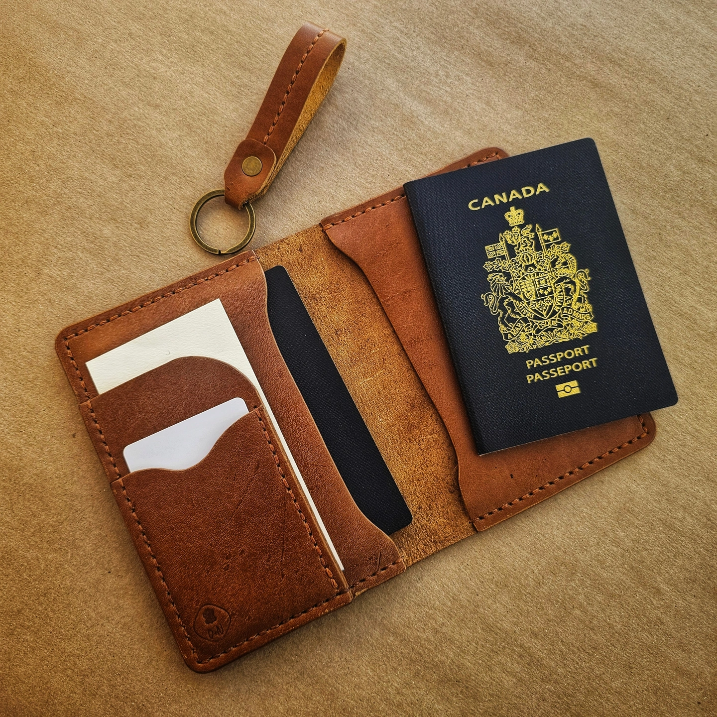 If you appreciate the natural marks on leather and want something unique, this fully handmade leather passport wallet and matching keychain are for you. No machines are involved. Every step is done by hand, from cutting to stitching. We are a proudly Canadian, family run small business. *100% high quality cowhide leather *Two passport slots, one card pocket, and a separate pocket for documents like boarding passes, cash, or other items * Fully hand cut and hand stitched by our small family business *Thoughtful gift for Christmas, birthdays, Mother’s Day, Father’s Day, or any special occasion