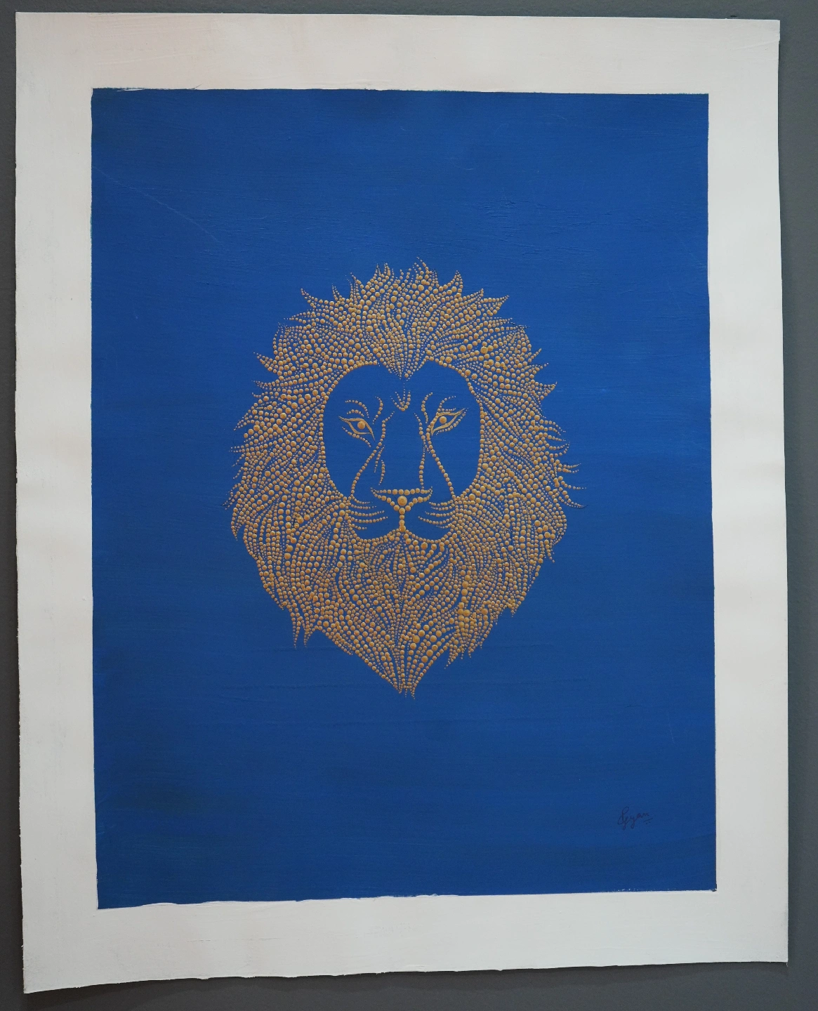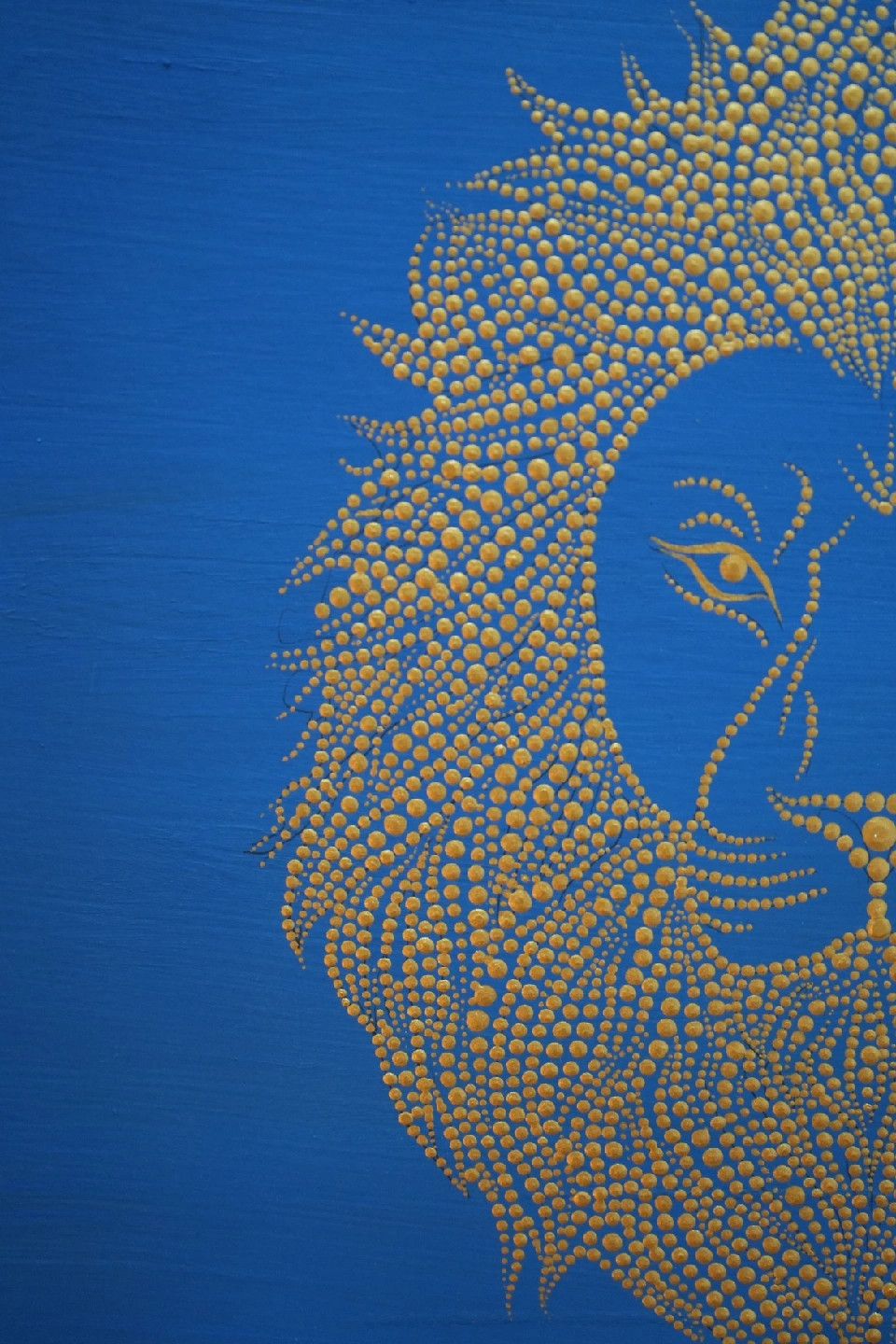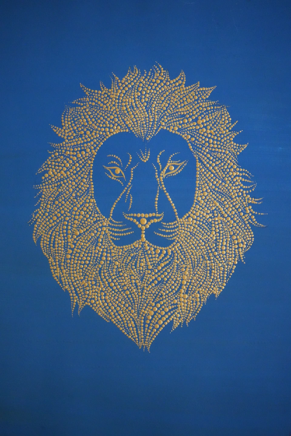 Unique dot art painting of a lion's head on a blue background. The lion is depicted in gold dots, creating a striking contrast. It would make a great addition to any home!