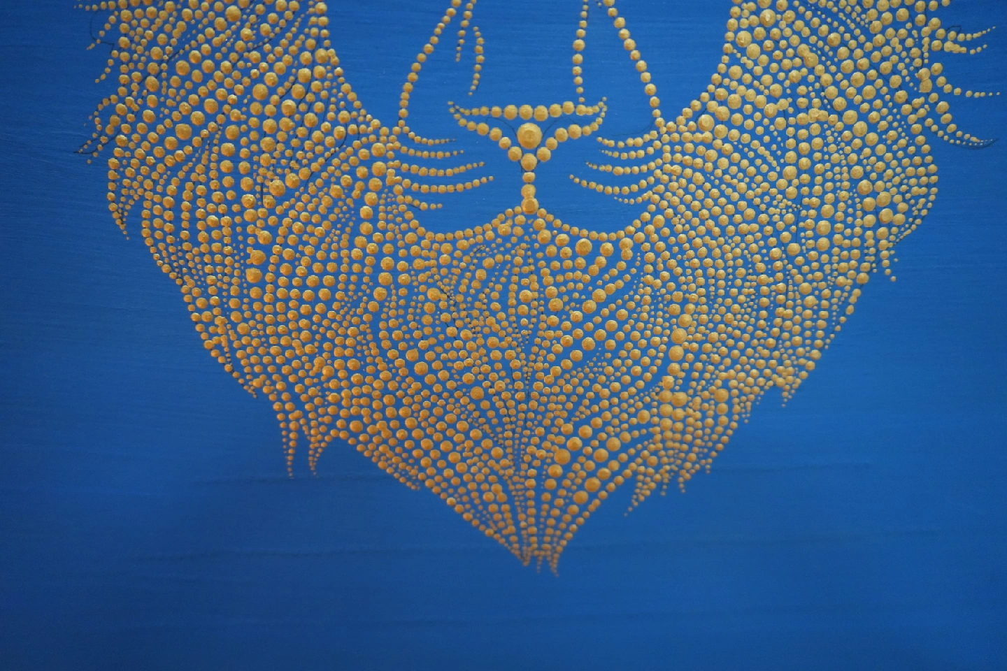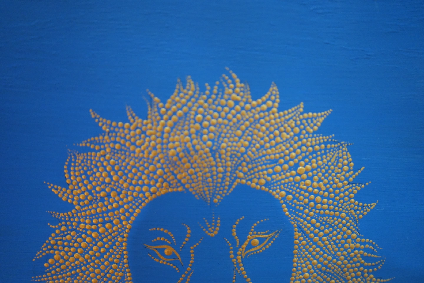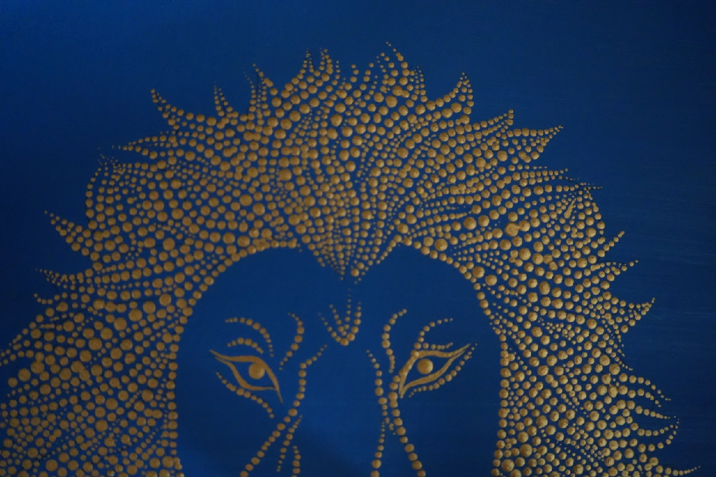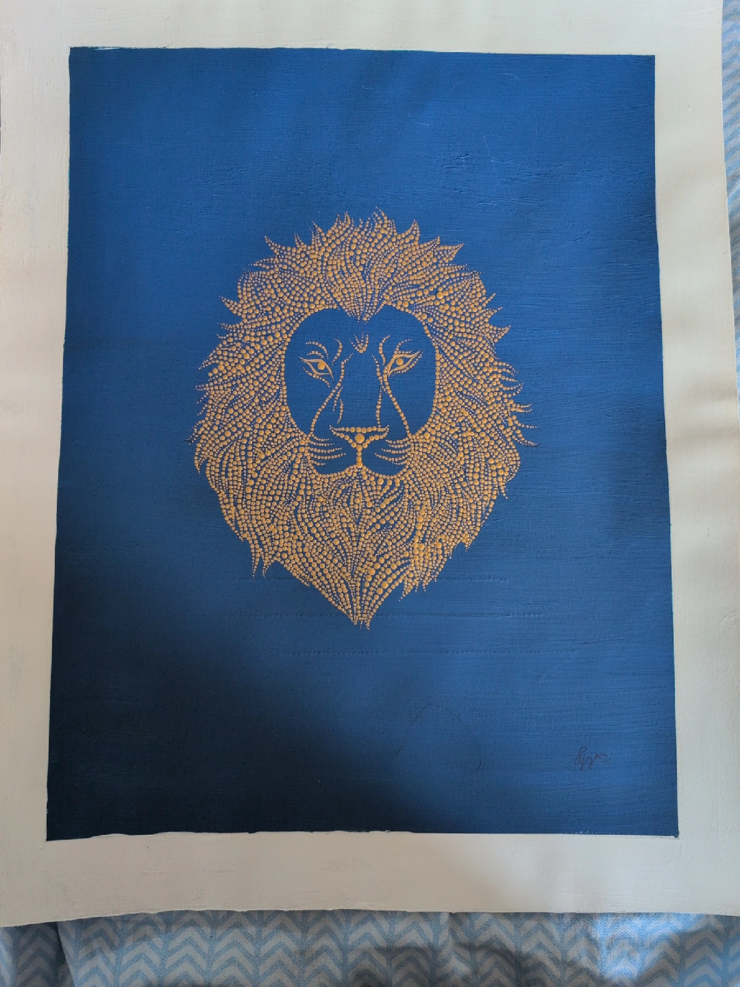 Unique dot art painting of a lion's head on a blue background. The lion is depicted in gold dots, creating a striking contrast. It would make a great addition to any home!