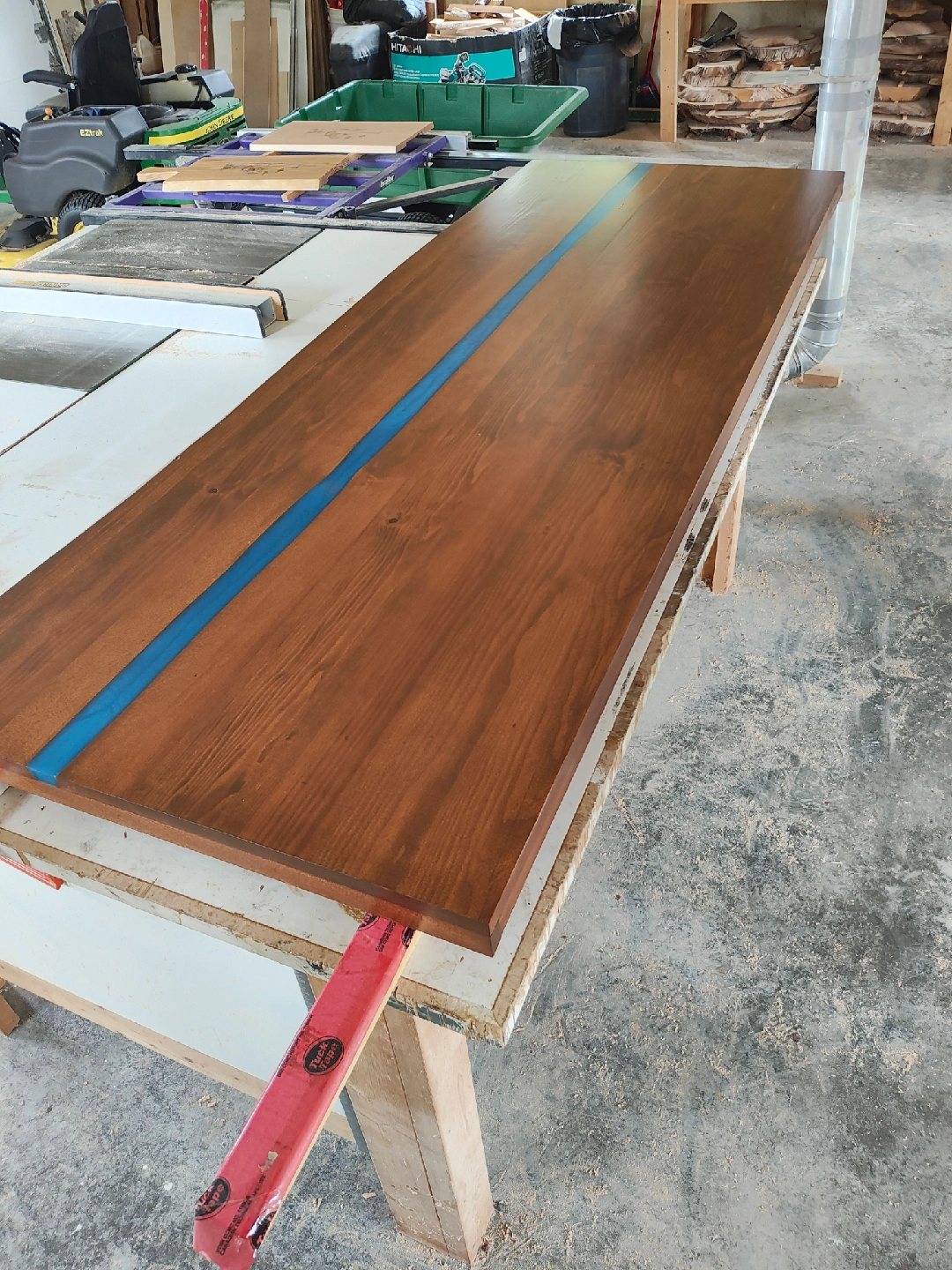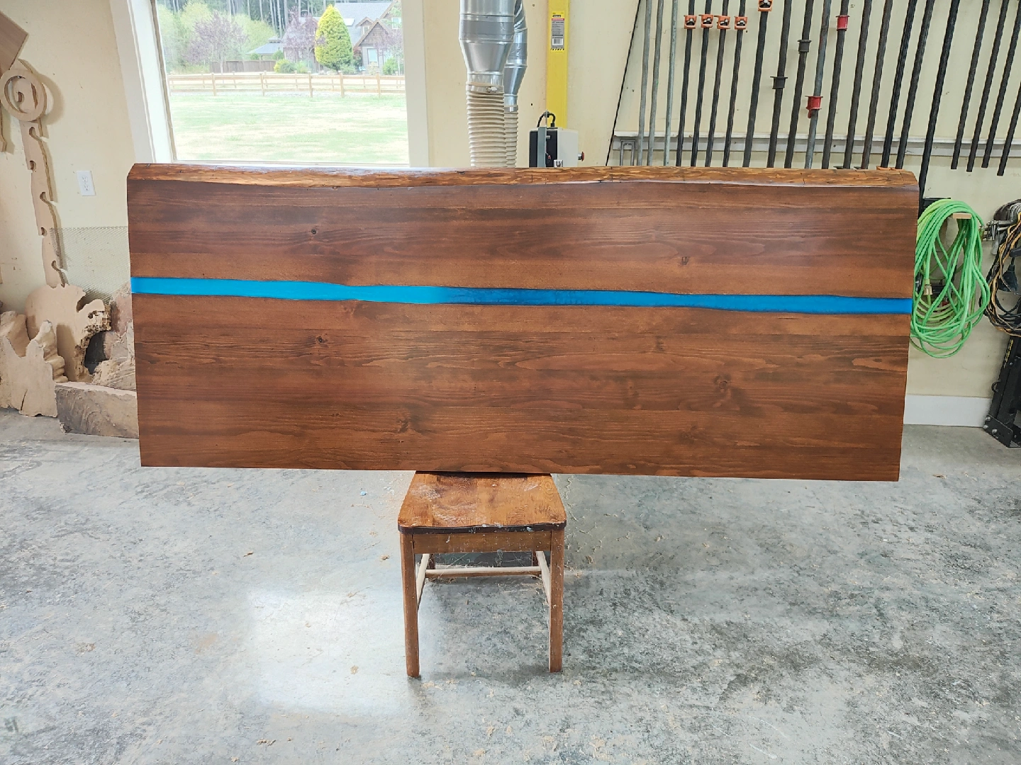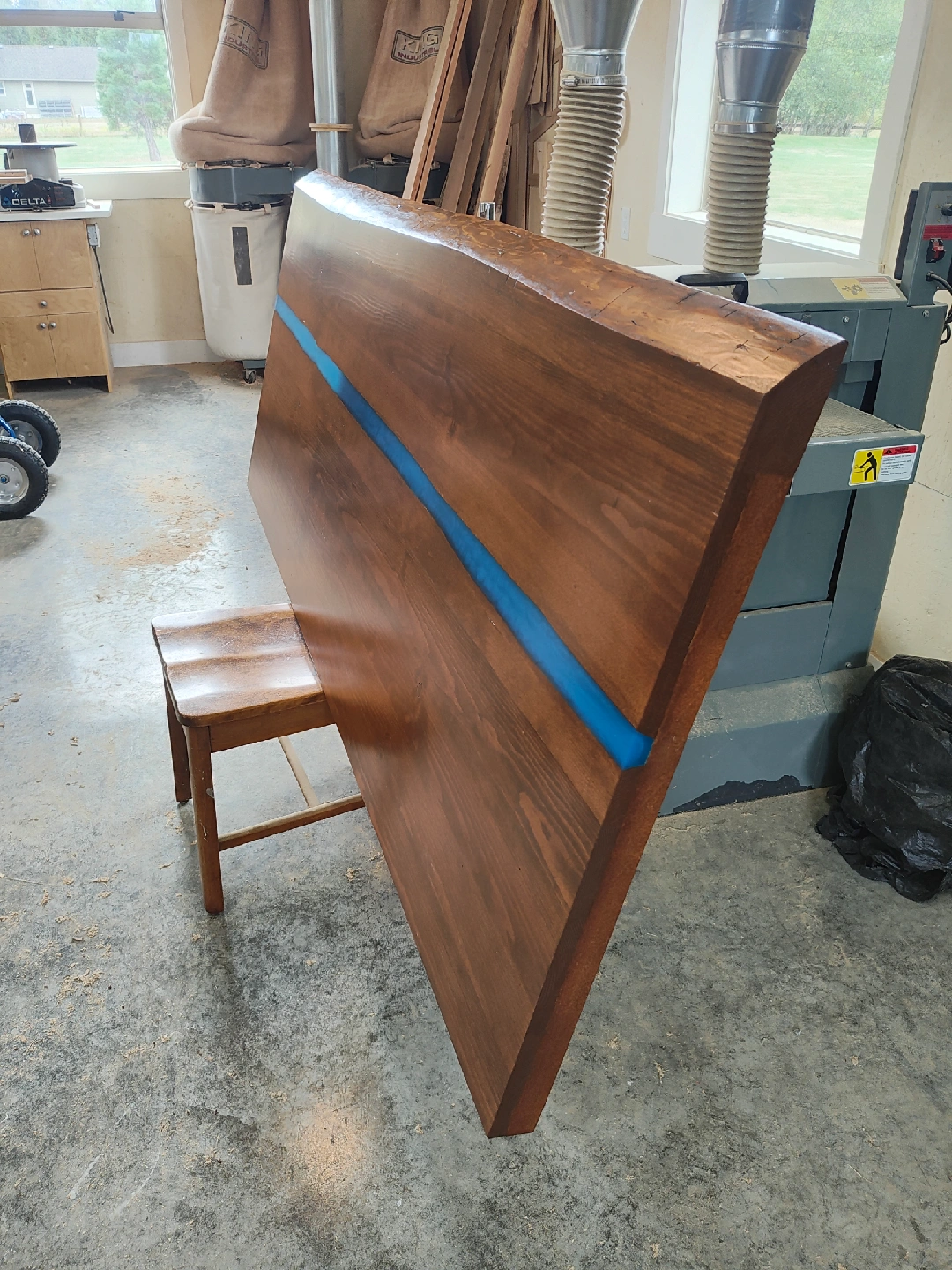 Selling a beautifull, handmade, live edge, fir king headboard featuring a unique blue epoxy river design! It's a one-of-a-kind piece that would add a touch of modern rustic charm to any space. The wood has a lovely warm tone, and the epoxy river is a striking blue. Includes mounting brackets. This headboard is sure to be a conversation starter! Local pickup only.