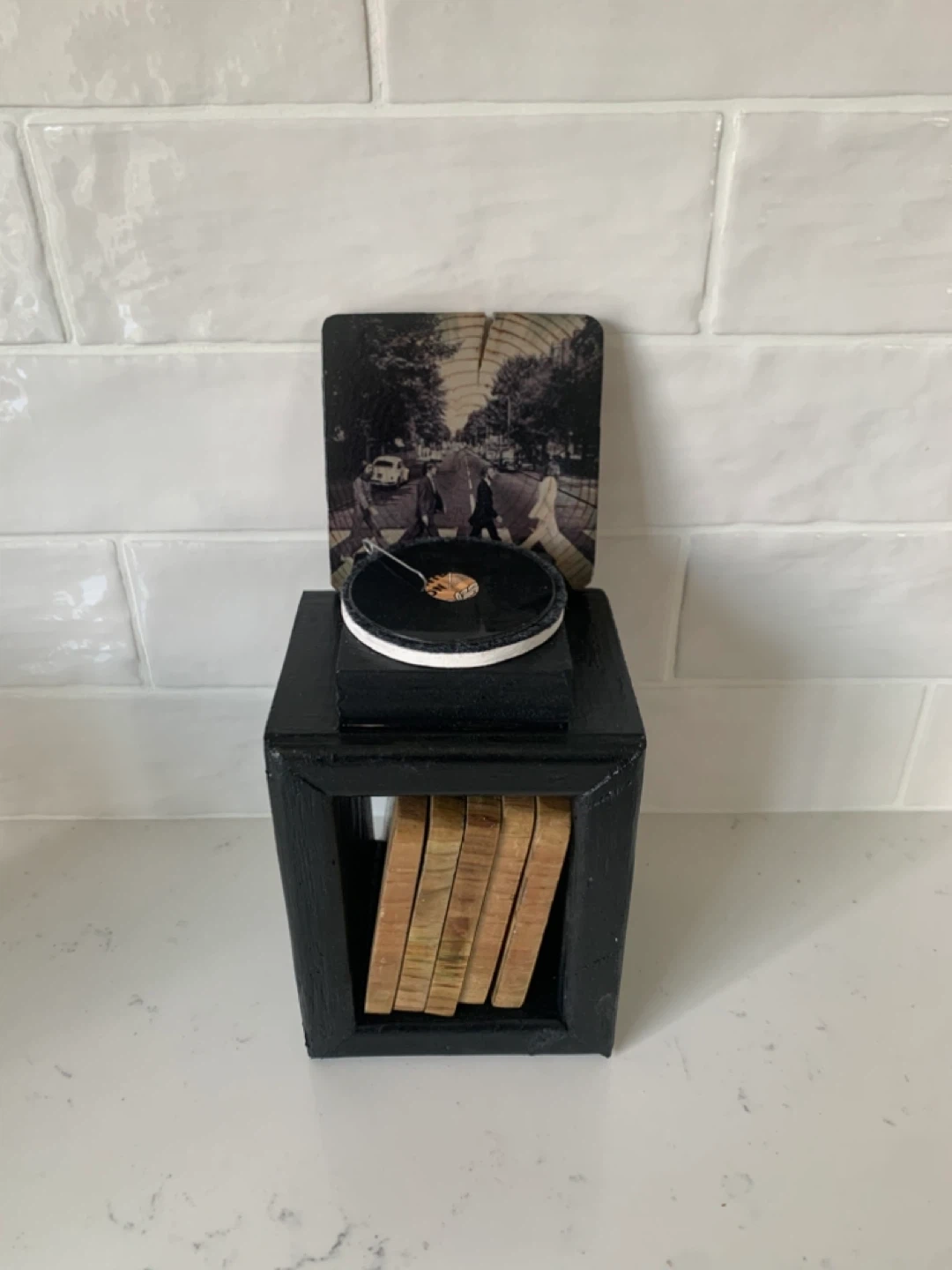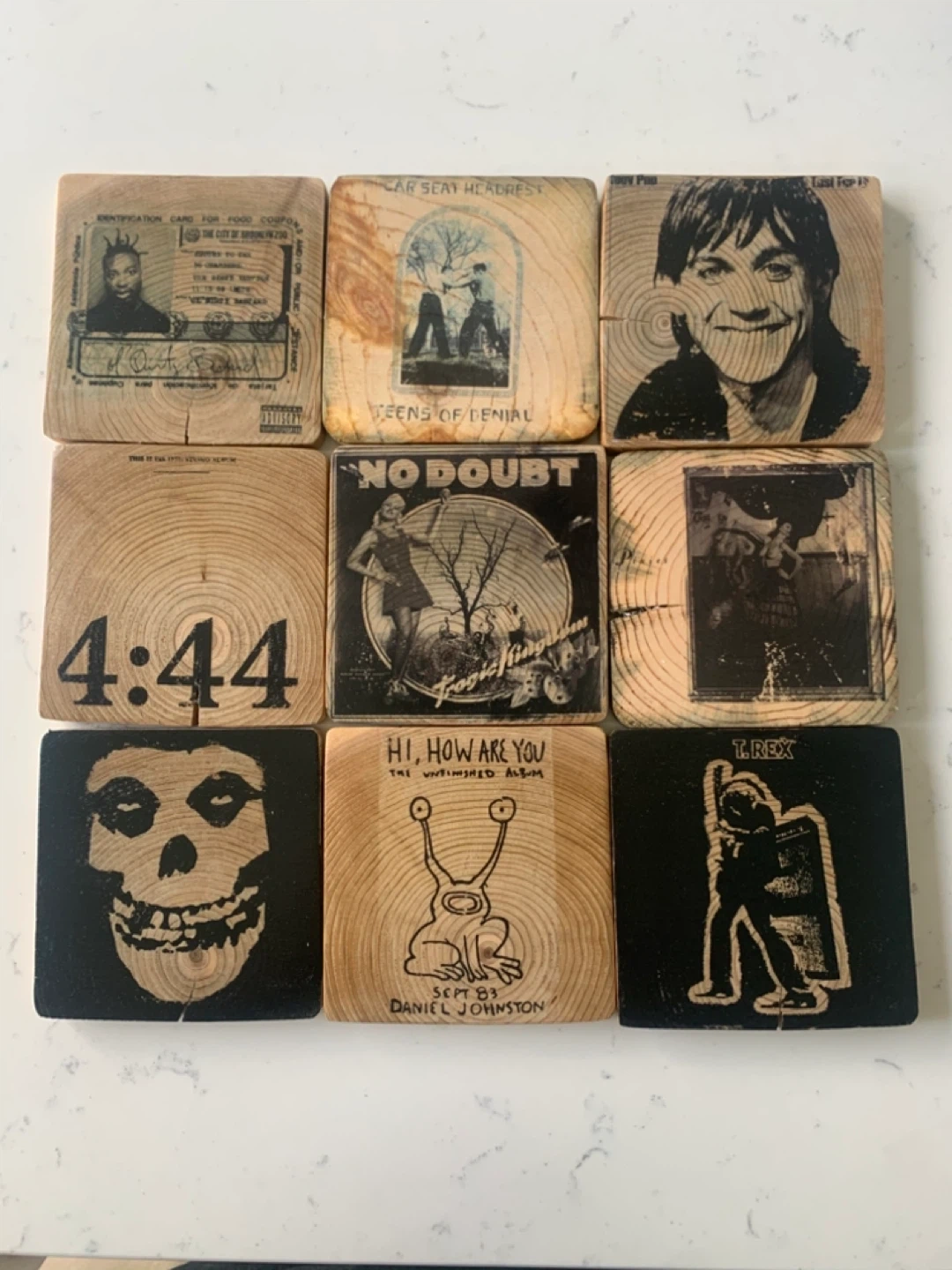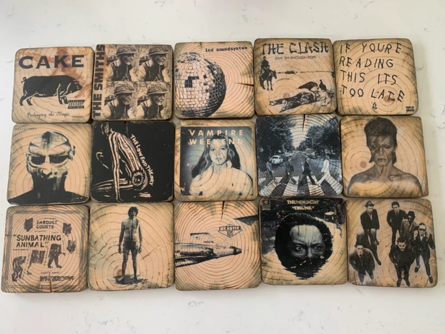Selling a handmade music-themed coaster set! It features iconic album covers and music references. A unique addition to any music lover's home! $60 for 6 coasters and the record player coaster holder