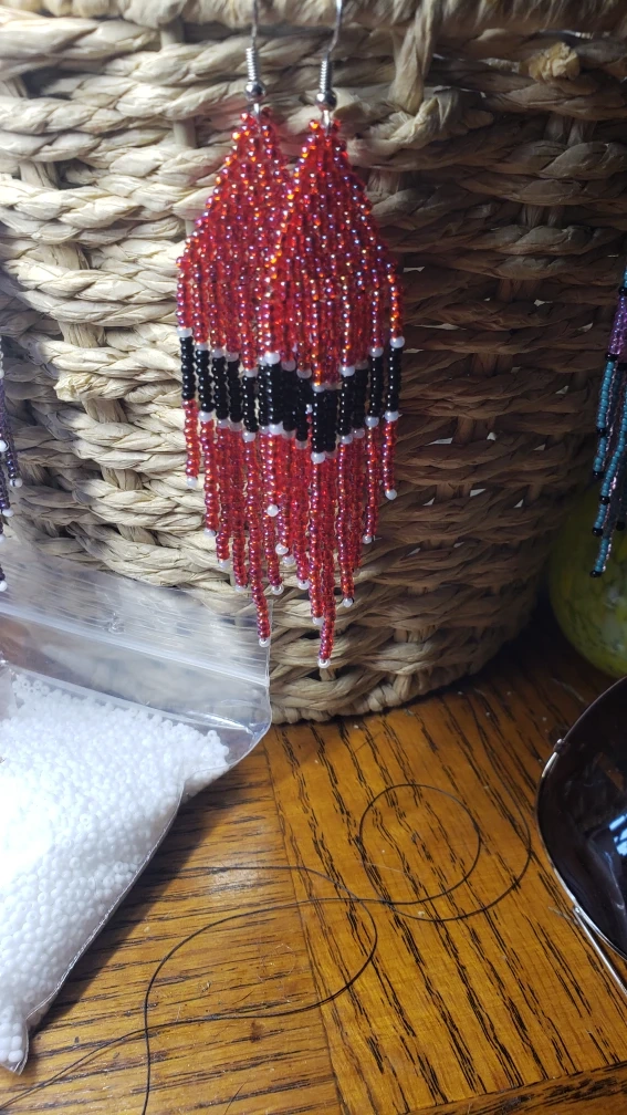 Check out these beautiful handmade native beaded fringe earrings! They feature a vibrant red colour with black and white accents. Perfect for adding a pop of colour to any outfit