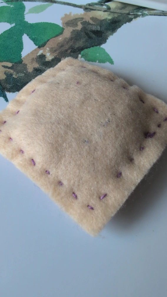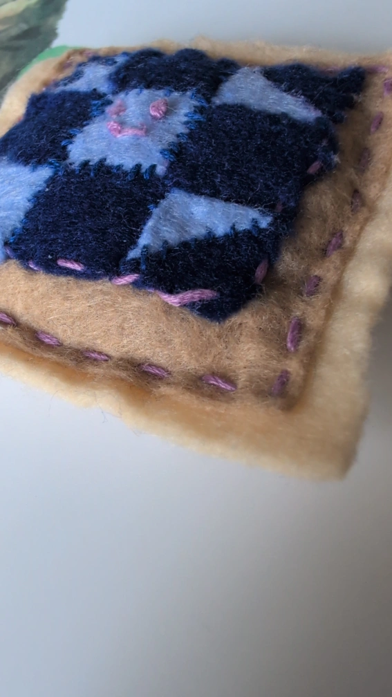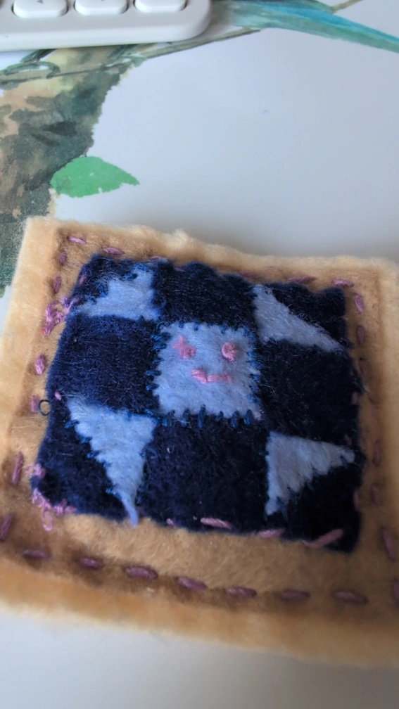 Here's a cute handmade pincushion! It's got a unique patchwork design with a little smiley face. Perfect for all your sewing needs!