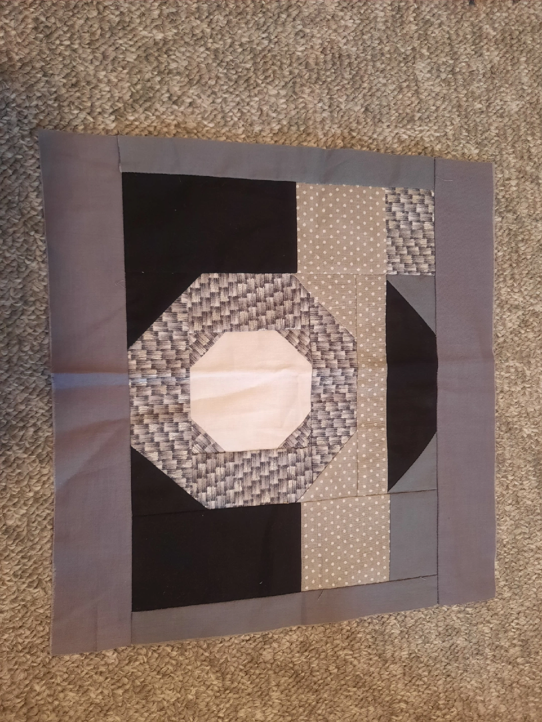 Here's a handmade quilted ! It features a geometric design in shades of grey and black.