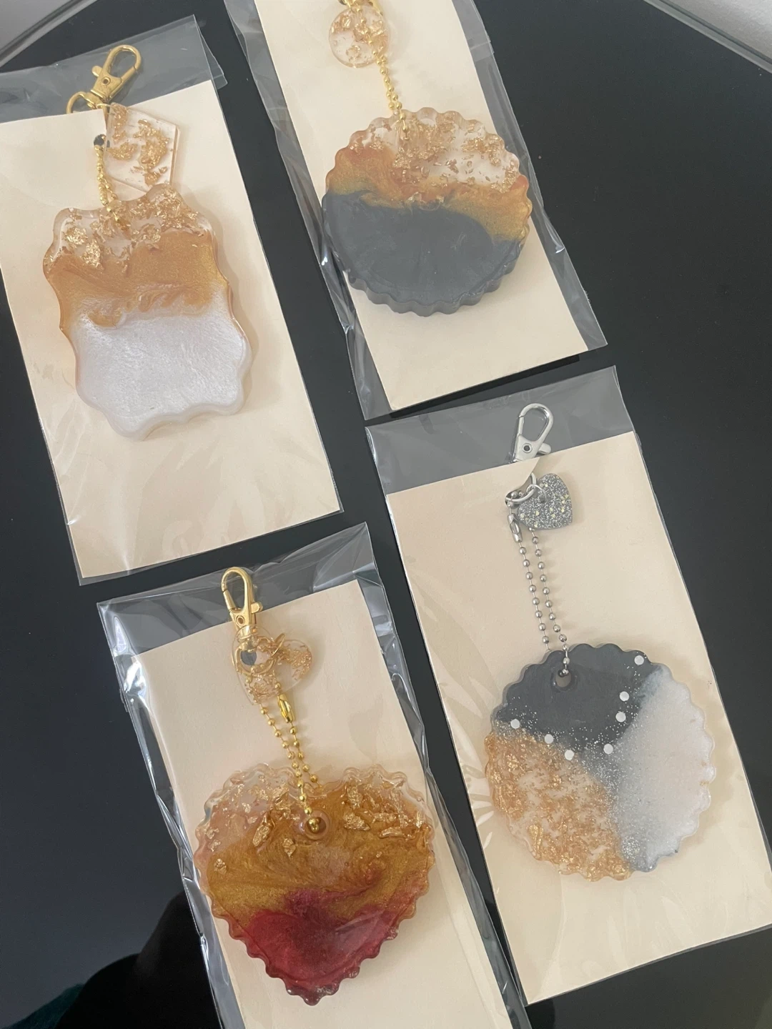 Check out these unique handmade resin keychains! Each one is carefully crafted with different colours and gold flakes, making them a lovely accessory for your keys or bag. They're all individually packaged and ready to go!