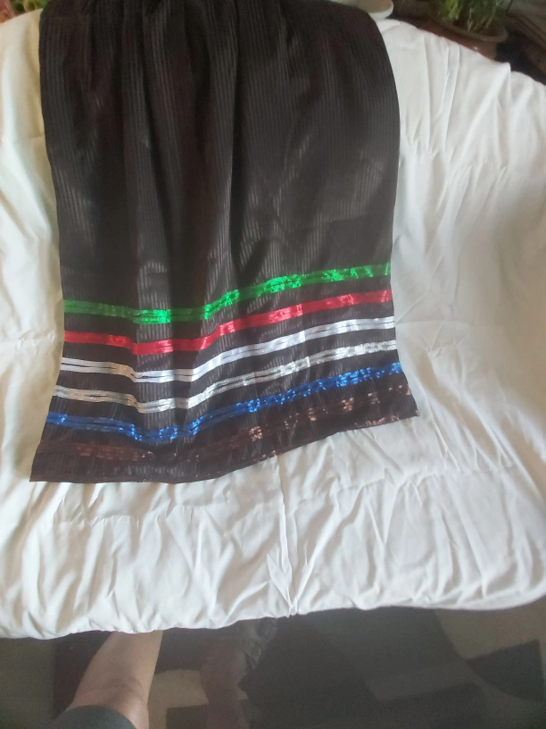 Selling handmade ribbon skirt! It features a dark brown colour with colourful ribbons at the bottom. Perfect for traditional events or everyday wear!