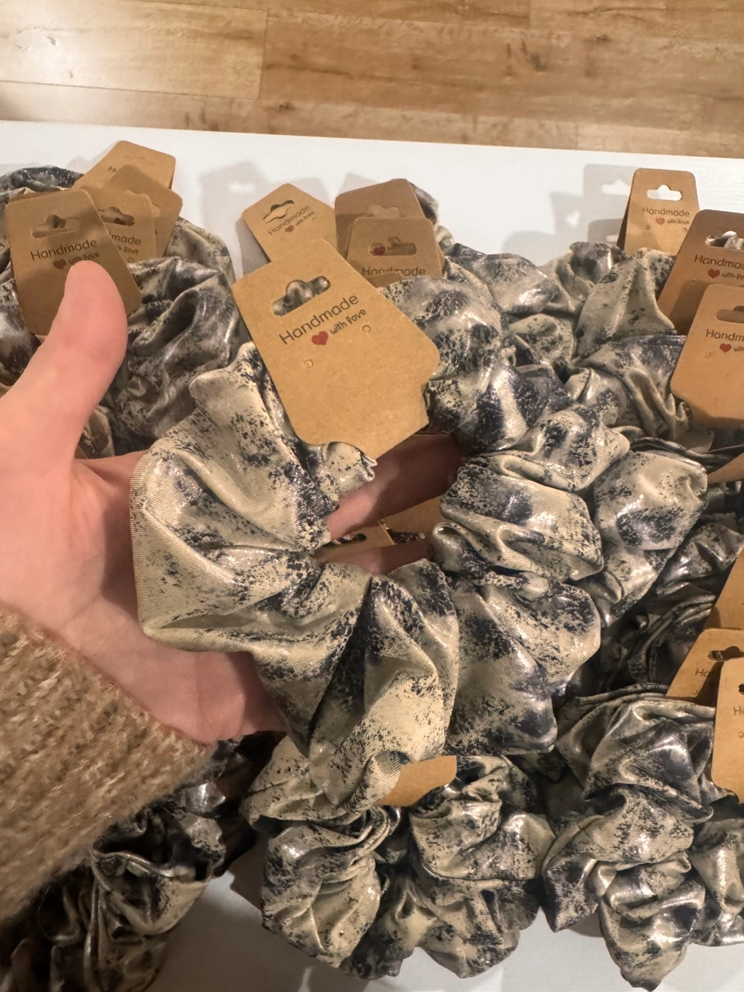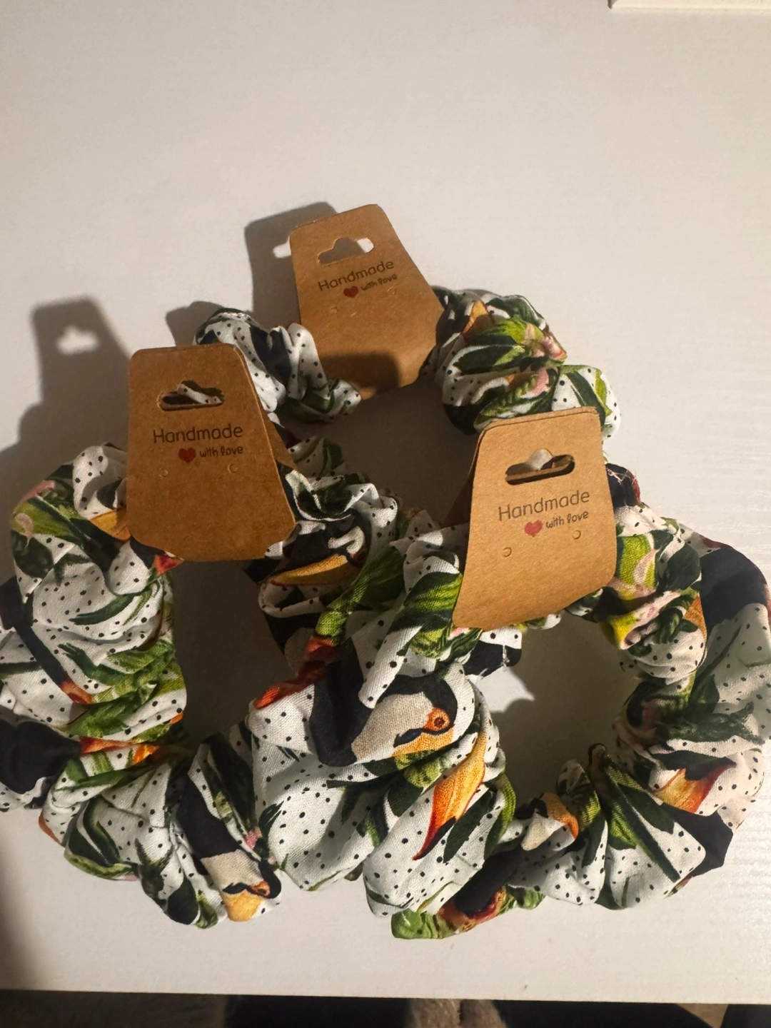 Set of assorted scrunchies. Features various prints: toucans, leopard, and a metallic. Soft and stretchy. Perfect for hair styling. Are on sale separately $6 to $7 dollars .all of them are handmade by me . Thank you for your interest
