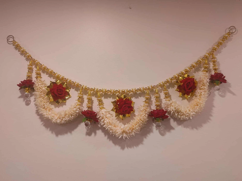 Beautiful handmade toran for your door or wall! It's decorated with artificial flowers, beads, and gold accents. Perfect for adding a touch of elegance to your home