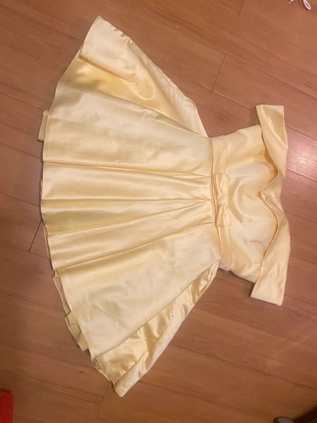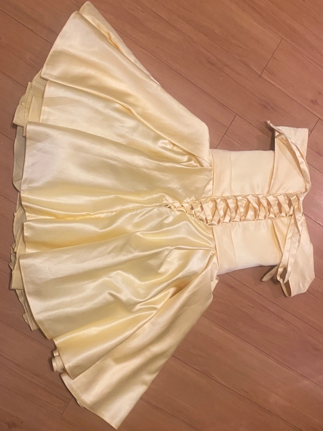 Pale yellow satin dress. Off-the-shoulder design. Lace-up back detail. A-line skirt. Originally paid $350 for it
