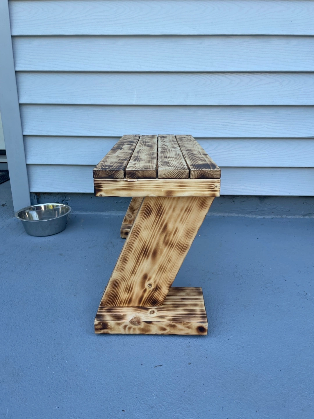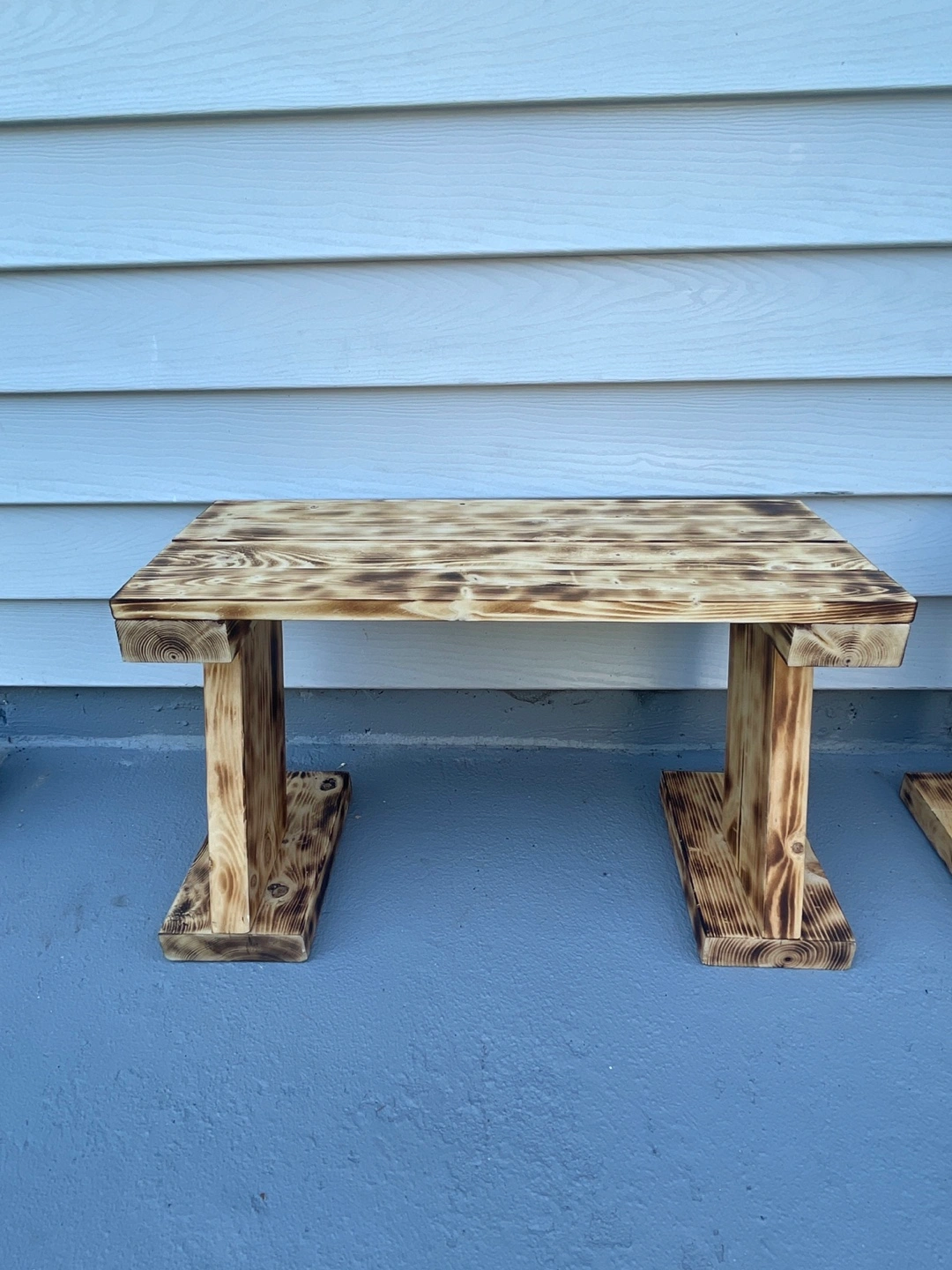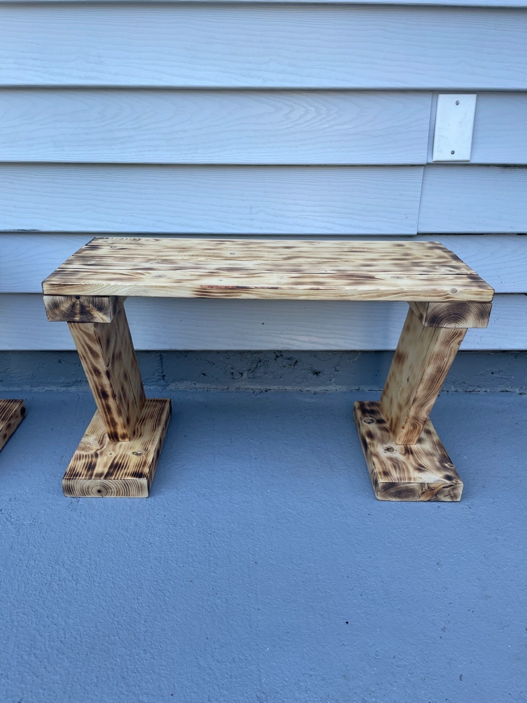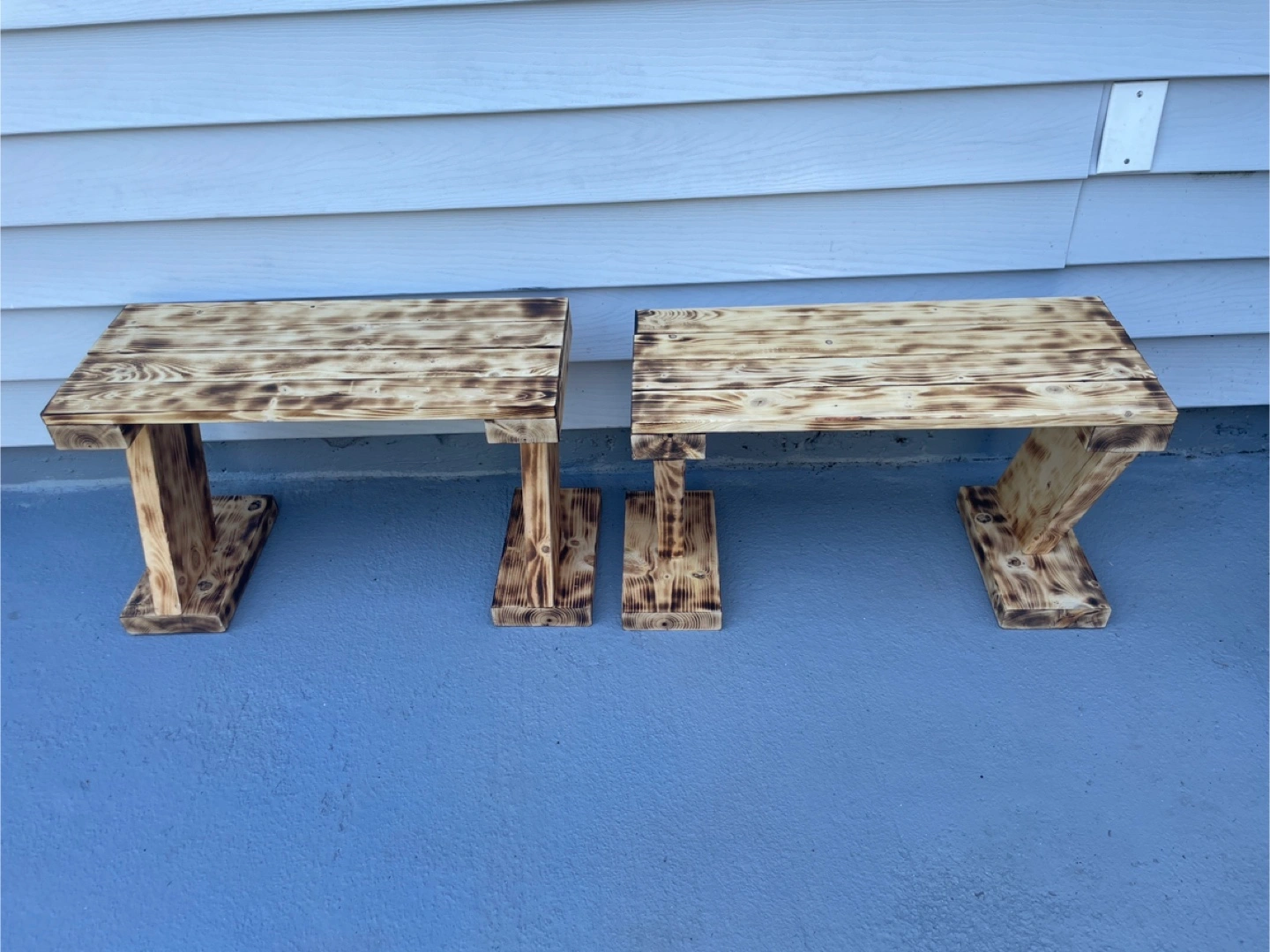 Selling a locally handmade wooden bench. It has a unique, eye-catching design with a lovely wood-burned finish. Perfect for adding a rustic touch to your home! $35 for one $50 for both