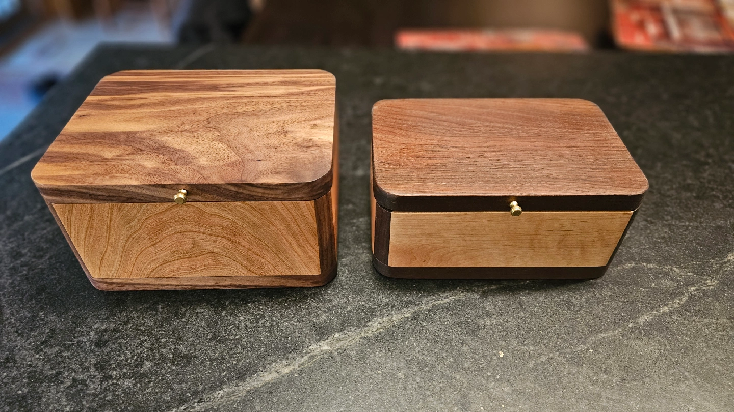 Selling two beautiful handmade wooden boxes. They features a two-tone wood design with Peruvian walnut darker lids and trim, cherry bodies and solid brass hardware. Perfect for storing small items! The larger one is about 9.5 x 7.5 x 5 inches. The smaller one is about 9 x 6 x 4.25 inches