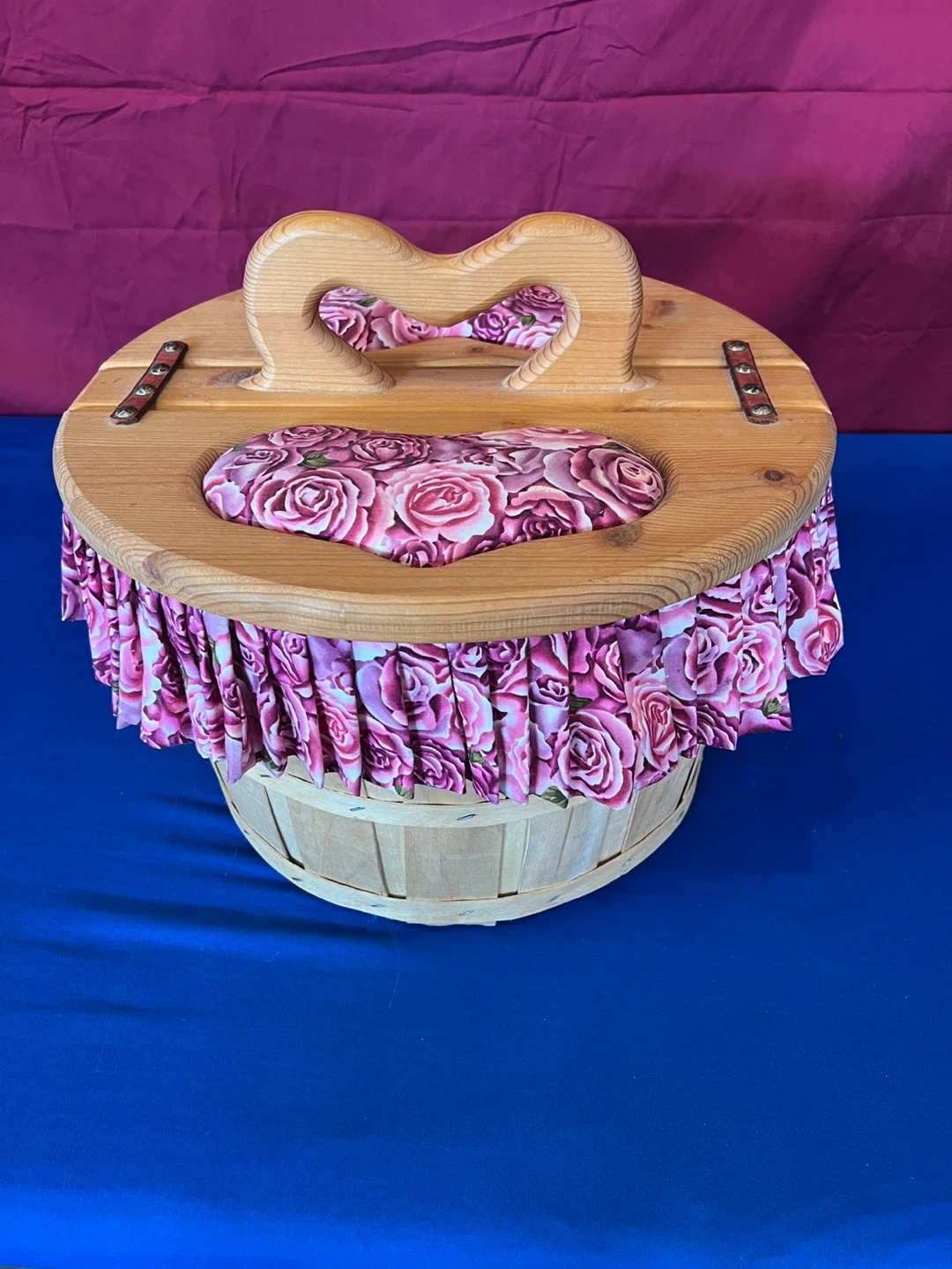 This is a charming, handmade wooden sewing /yarn basket! It features a lovely floral fabric design and a unique wooden handle. It's perfect for storing your sewing/knitting/crocheting supplies. It’s approximately 14 1/2” in circumference and 14” high. Both sides open and the inside is lined. It's in great condition and ready for a new home! Non Smoking, Pet friendly home. (Numbers are for seller’s purpose) Cross Posted, No try-ons or returns