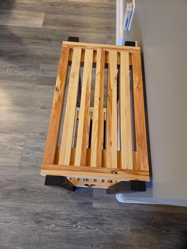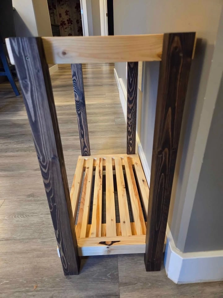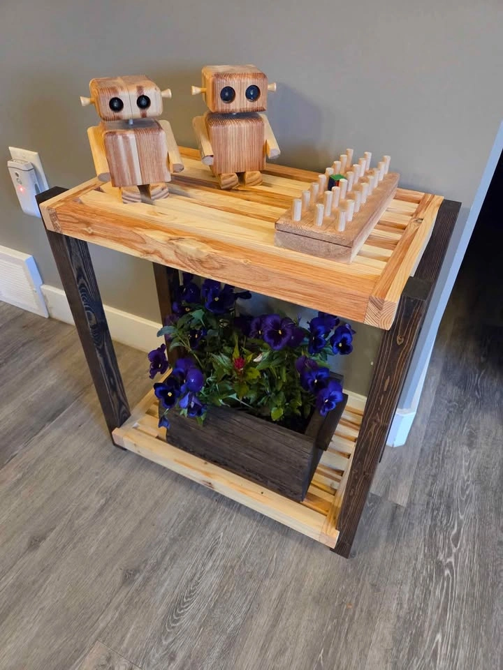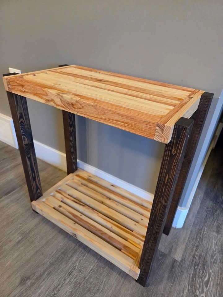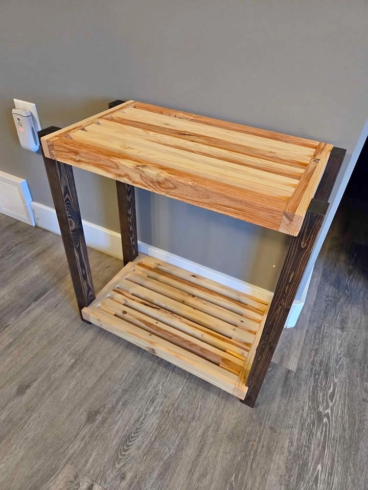 20"W x 21"H x 12"D Every so often you find that wood grain that just needs to be shown off I designed this table to be perfect end table for that favorite chair on your deck. Rain will just flow thru instead of pool on top The shelves on this table are constructed of upcycled and laminated lumber. The legs are Saskatchewan milled dimension Spruce The legs were stained with Dark Walnut stain and the entire piece was Tung oiled End table, plant stand, whatever you choose...it will be a nice addition for your deck at home or the cabin....enjoy