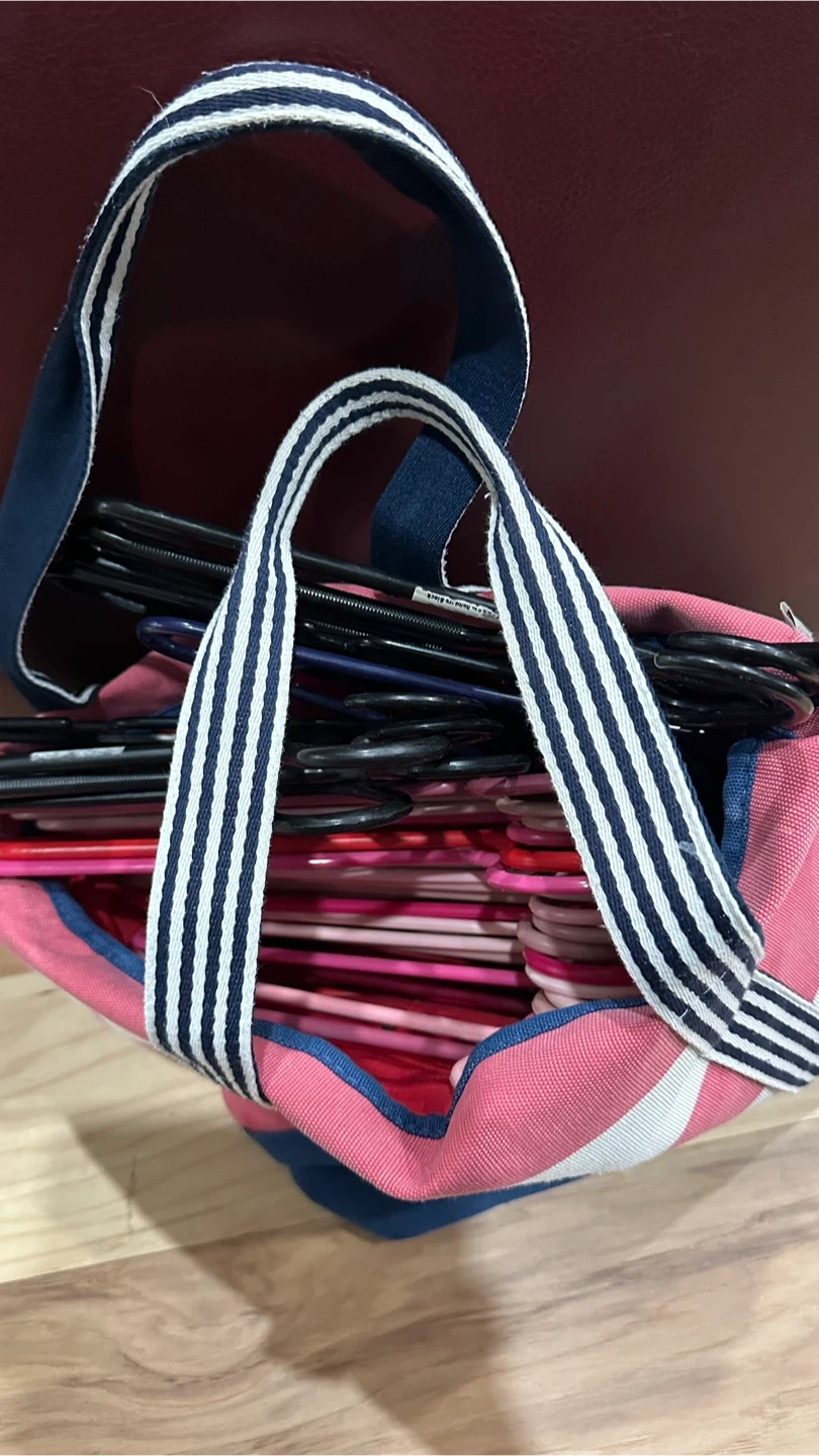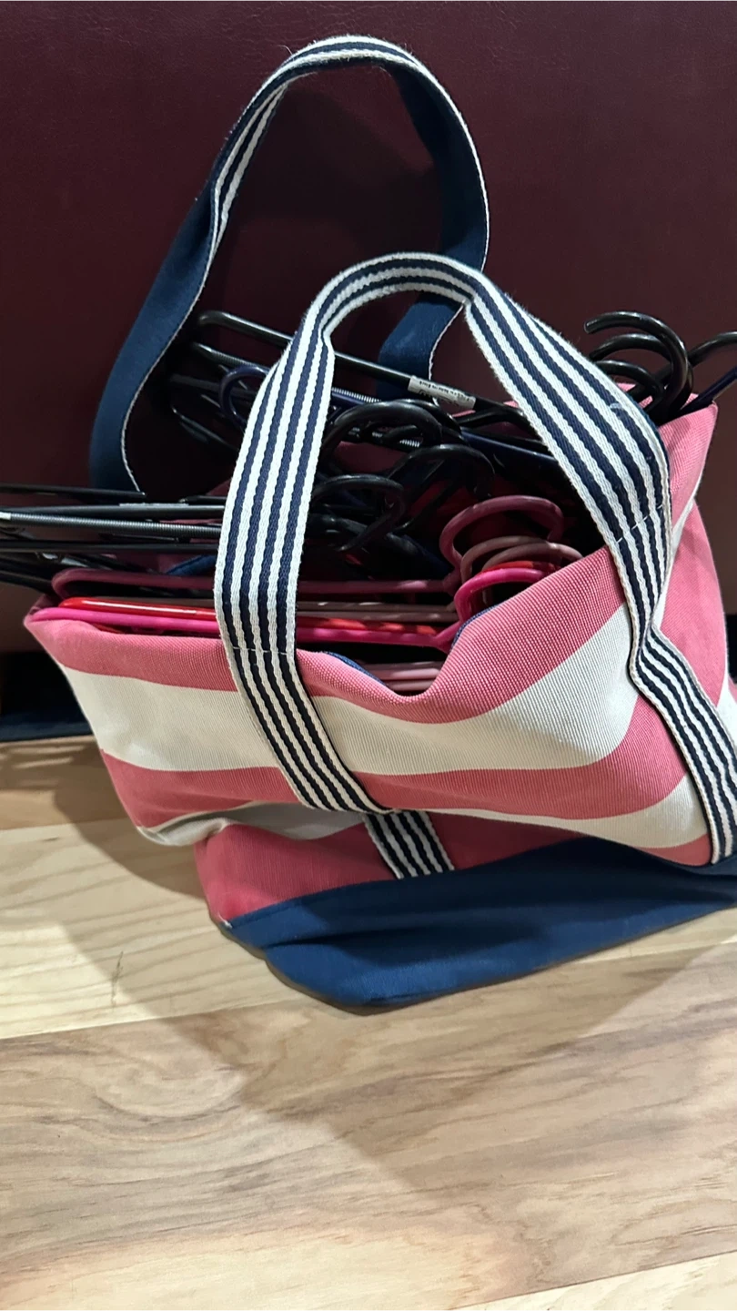Selling a tote bag filled with hangers. The tote bag is pink, white, and blue striped. It's perfect for storing your clothes or carrying items on the go. 35 hangers included Porch pick up Smoke free home Woodbine and Lumsden