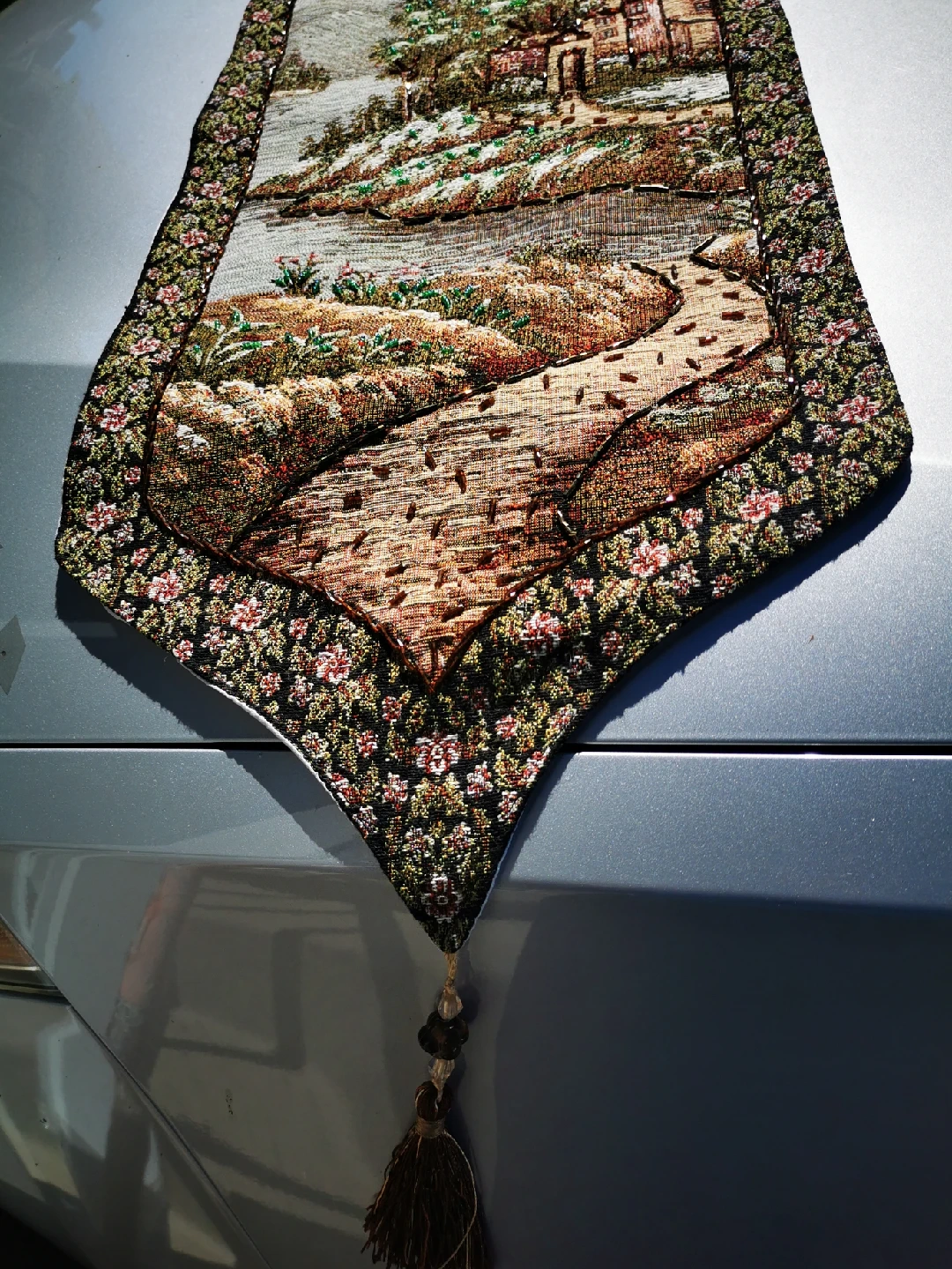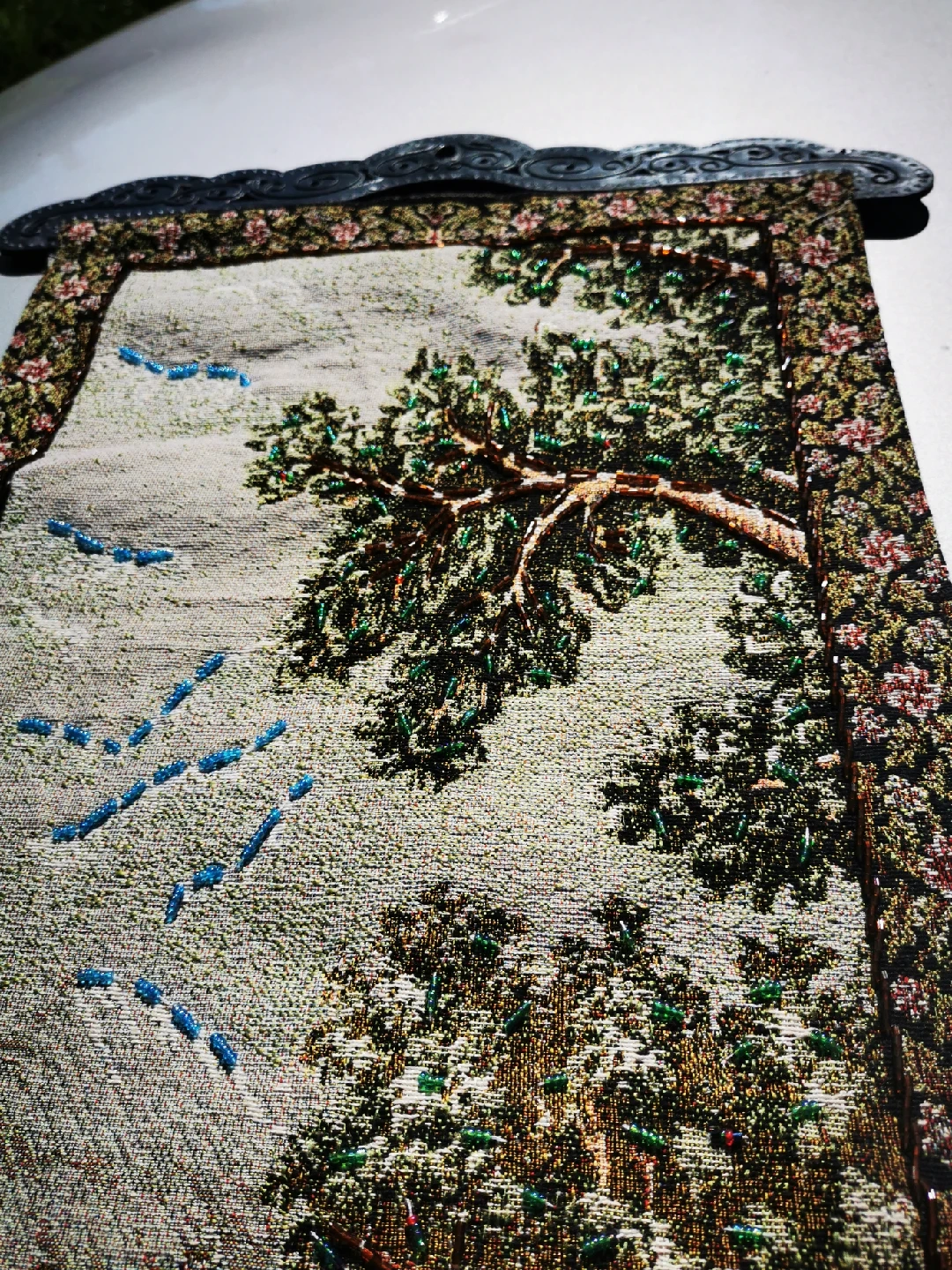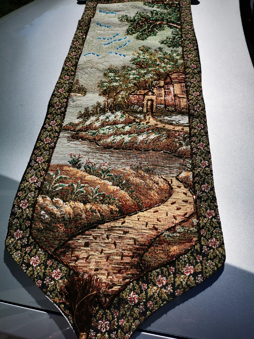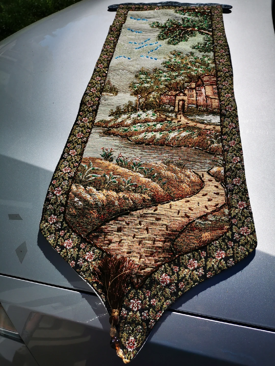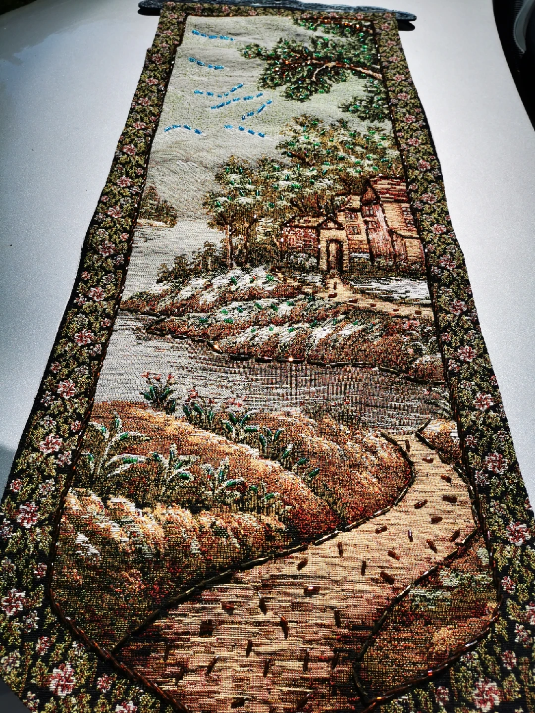 Beautiful hand made hanging picture featuring a scenic landscape with a path, river, and house. The edges are decorated with a floral pattern. Perfect for wall or any other surface!