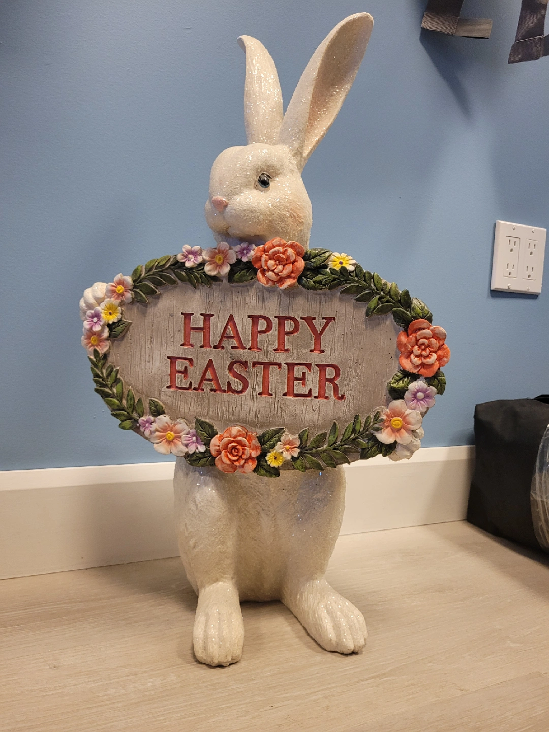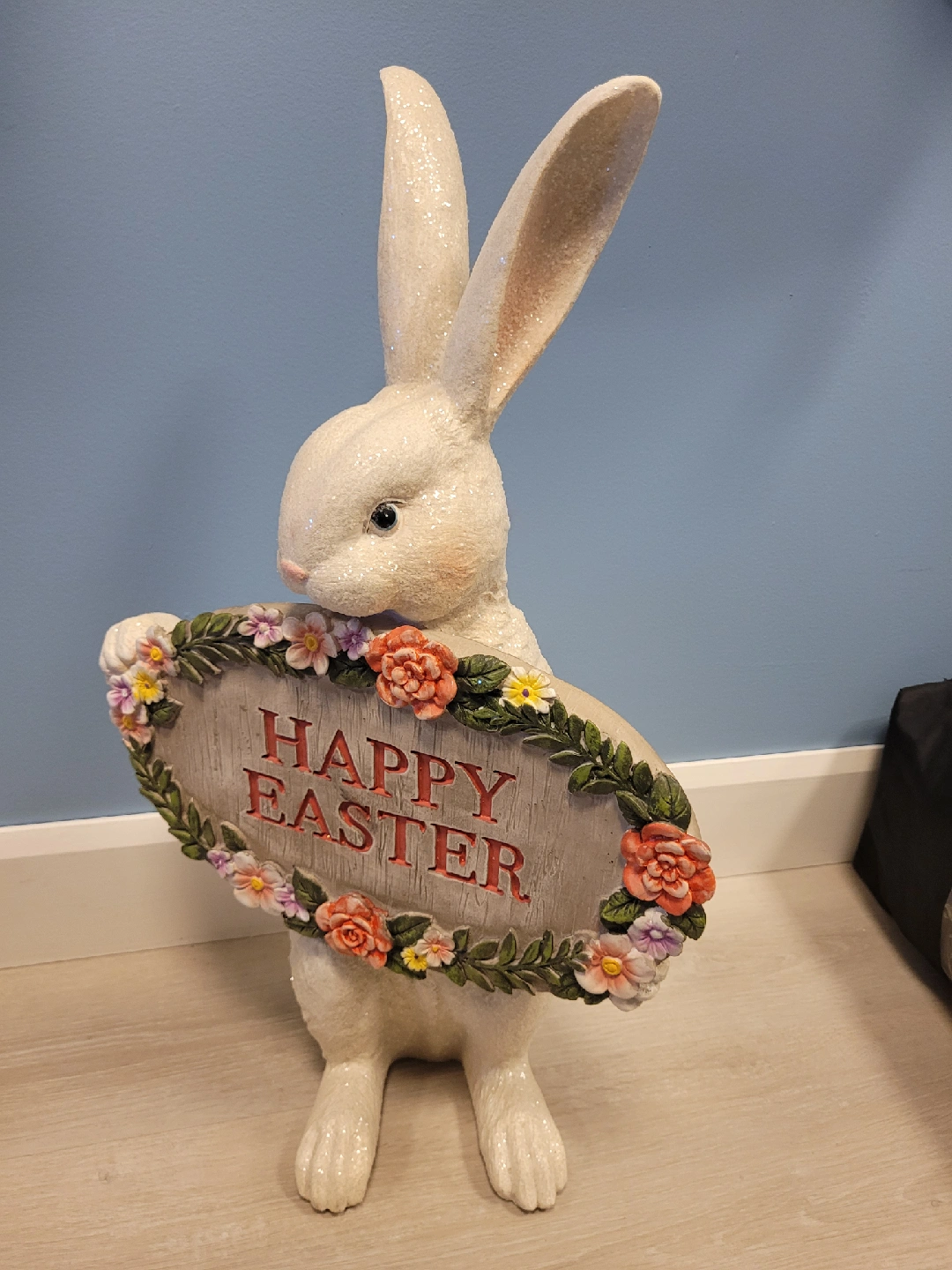 A cute Easter bunny decoration holding a sign that says 'Happy Easter'! Perfect for adding a festive touch to your home. Size: 25 inches tall * Pick up in store at 258 Main Street South, Newmarket (by appointment only to guarantee we are open). *** Payable by cash, debit or credit ***