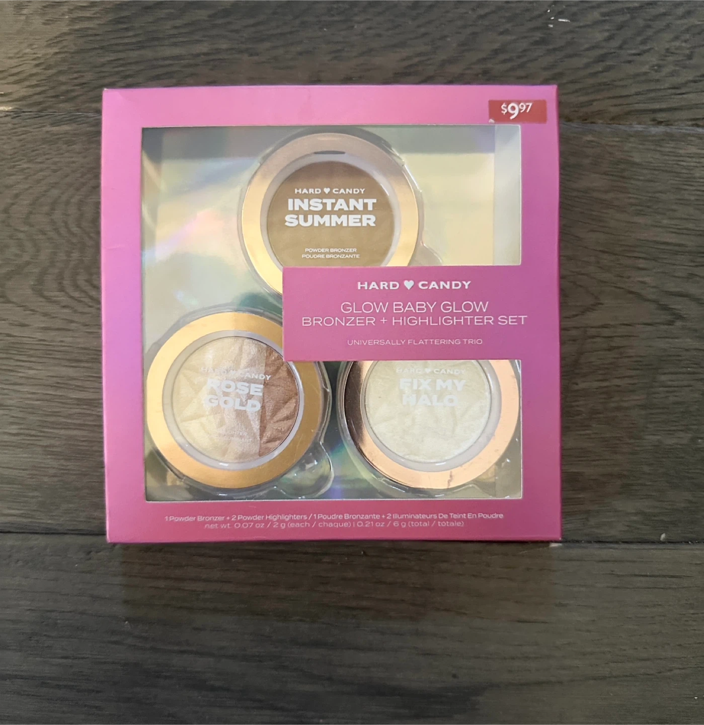 Selling a Hard Candy Glow Baby Glow Bronzer + Highlighter Set. It includes a powder bronzer and two powder highlighters. The set is called a universally flattering trio and includes Instant Summer, Rose Gold, and Fix My Halo. Originally priced at $9.97