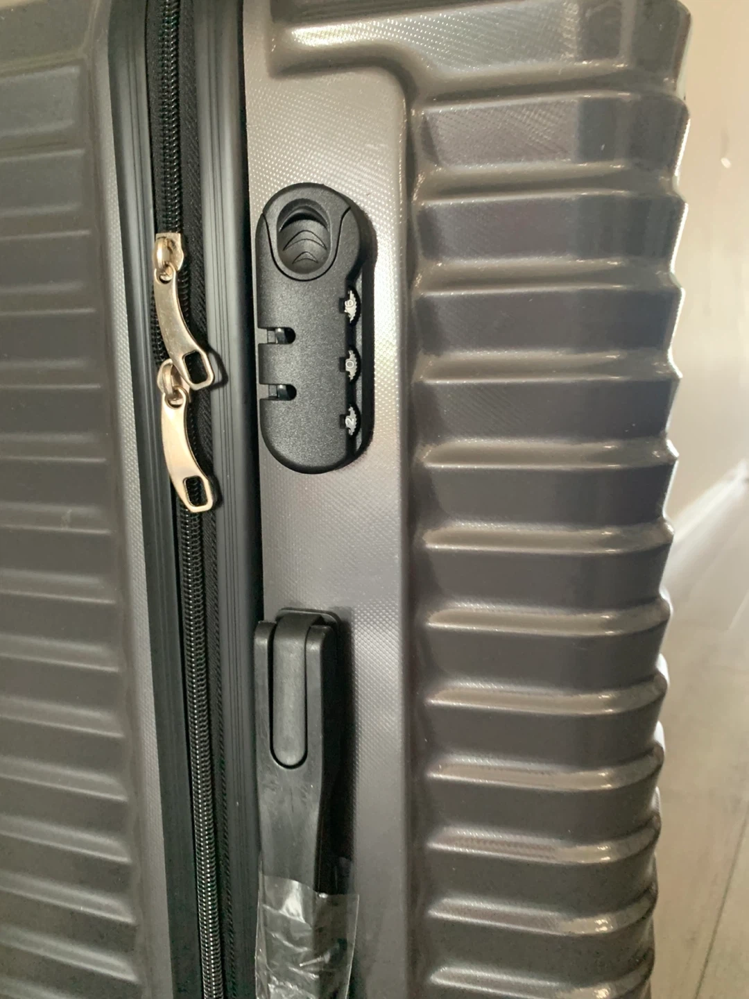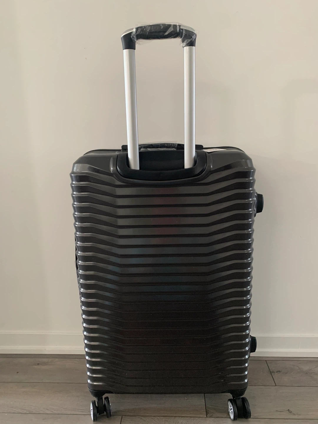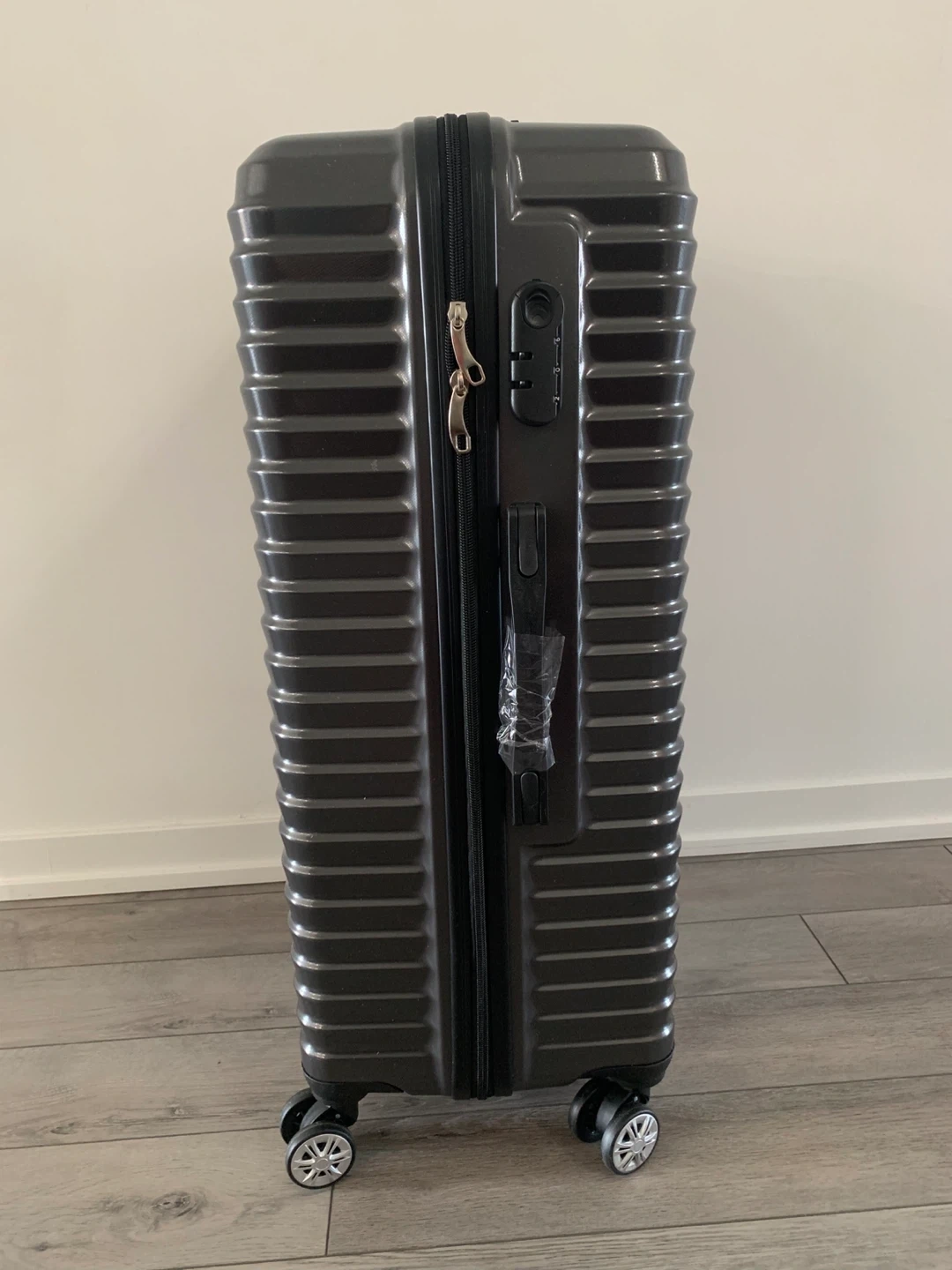 Selling a grey hard shell carry-on luggage. It has a combination lock and extendable handle. Great for travel!
