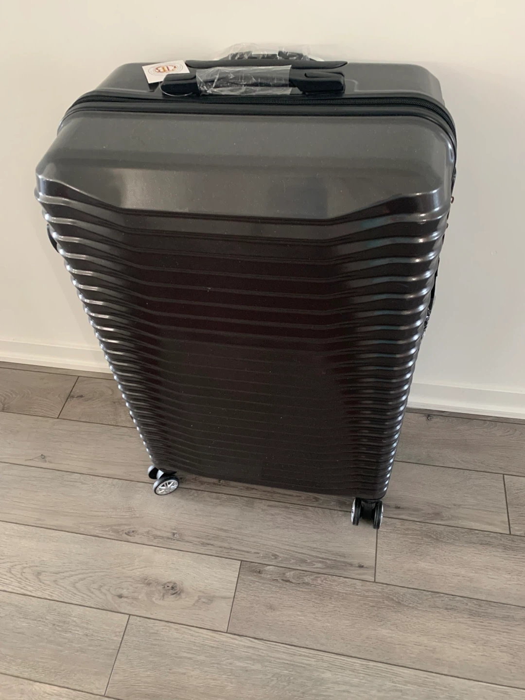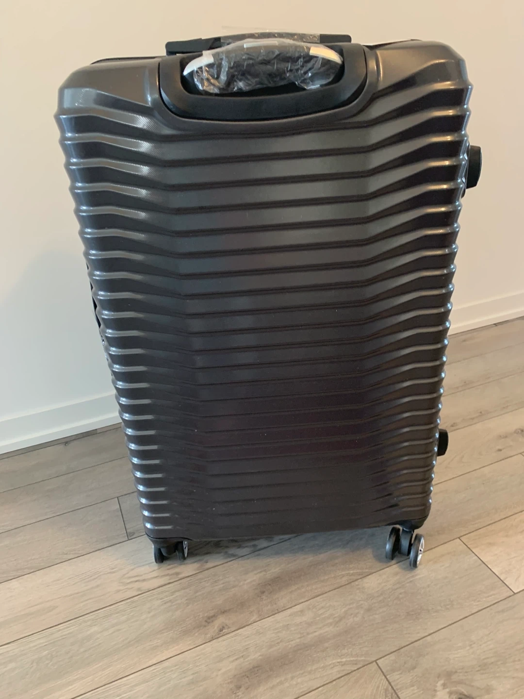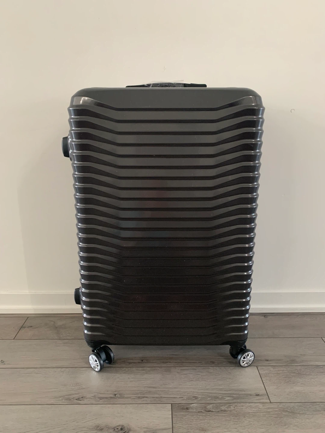 Selling a grey hard shell carry-on luggage. It has a combination lock and extendable handle. Great for travel!