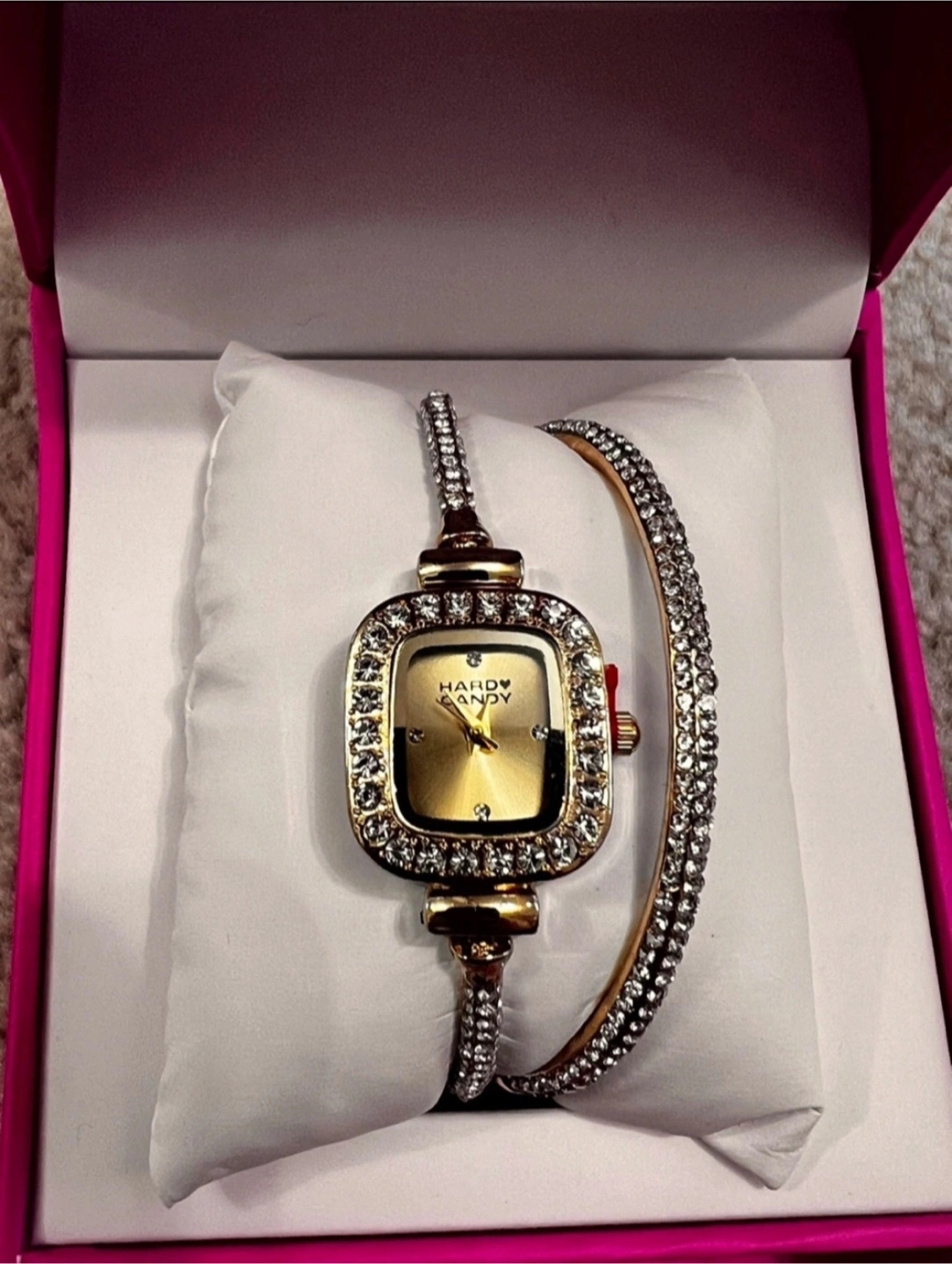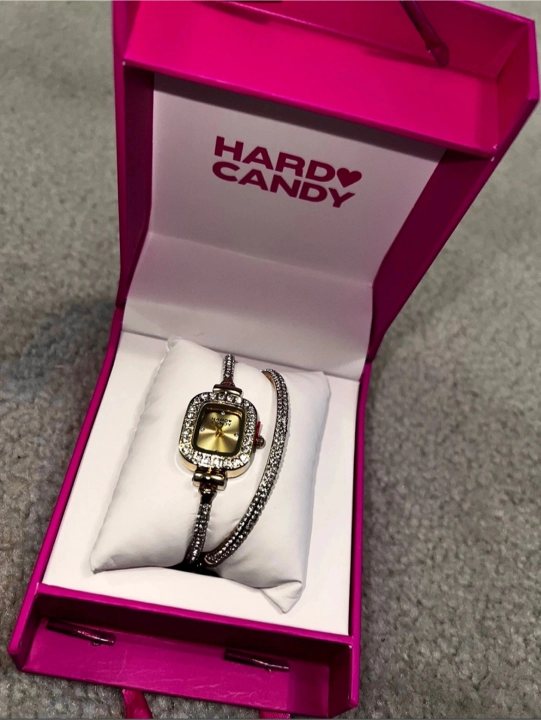 Brand new Hardy Candy watch and bracelet set! It comes in its original box, perfect for gifting or treating yourself. The set includes a watch with a gold-tone face and a matching bracelet, both adorned with sparkling crystals. A stylish addition to any outfit!