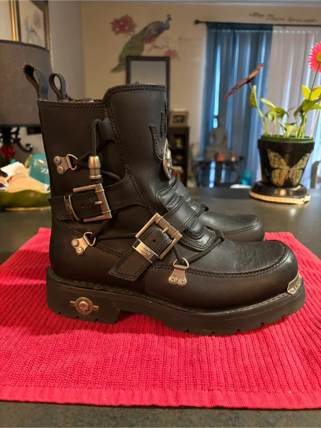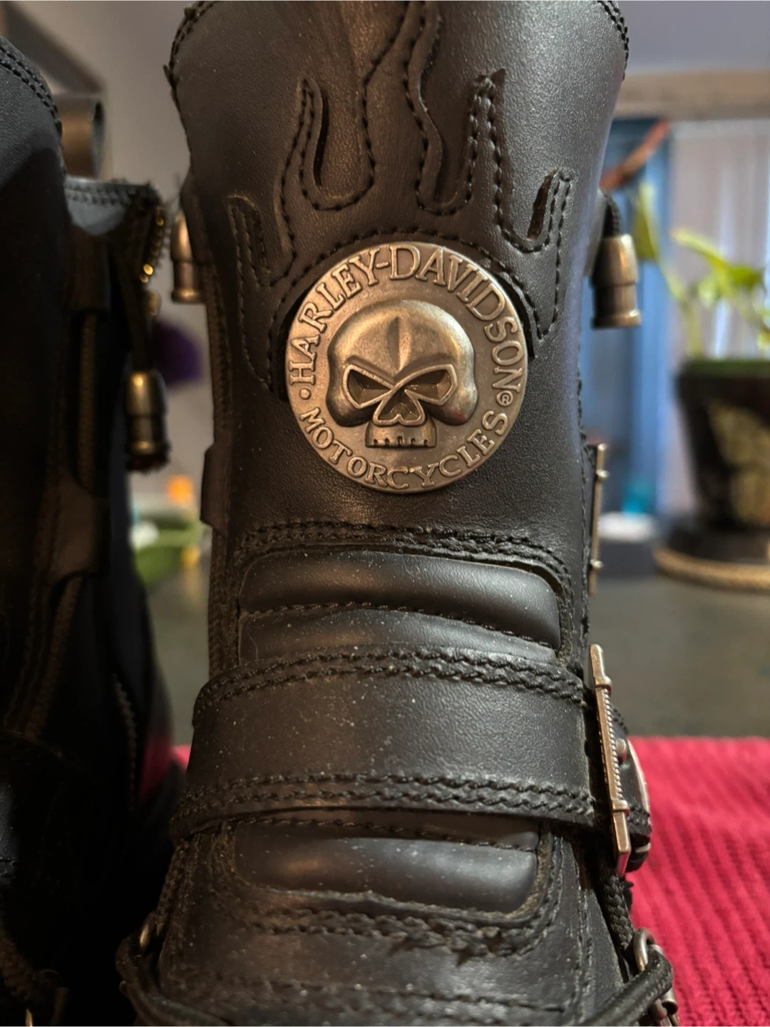 Selling a pair of Harley-Davidson motorcycle boots! They feature the iconic skull logo and buckle detailing. These boots are black and in good condition for hitting the road! Only worn twice! PRICE NEGOTIABLE