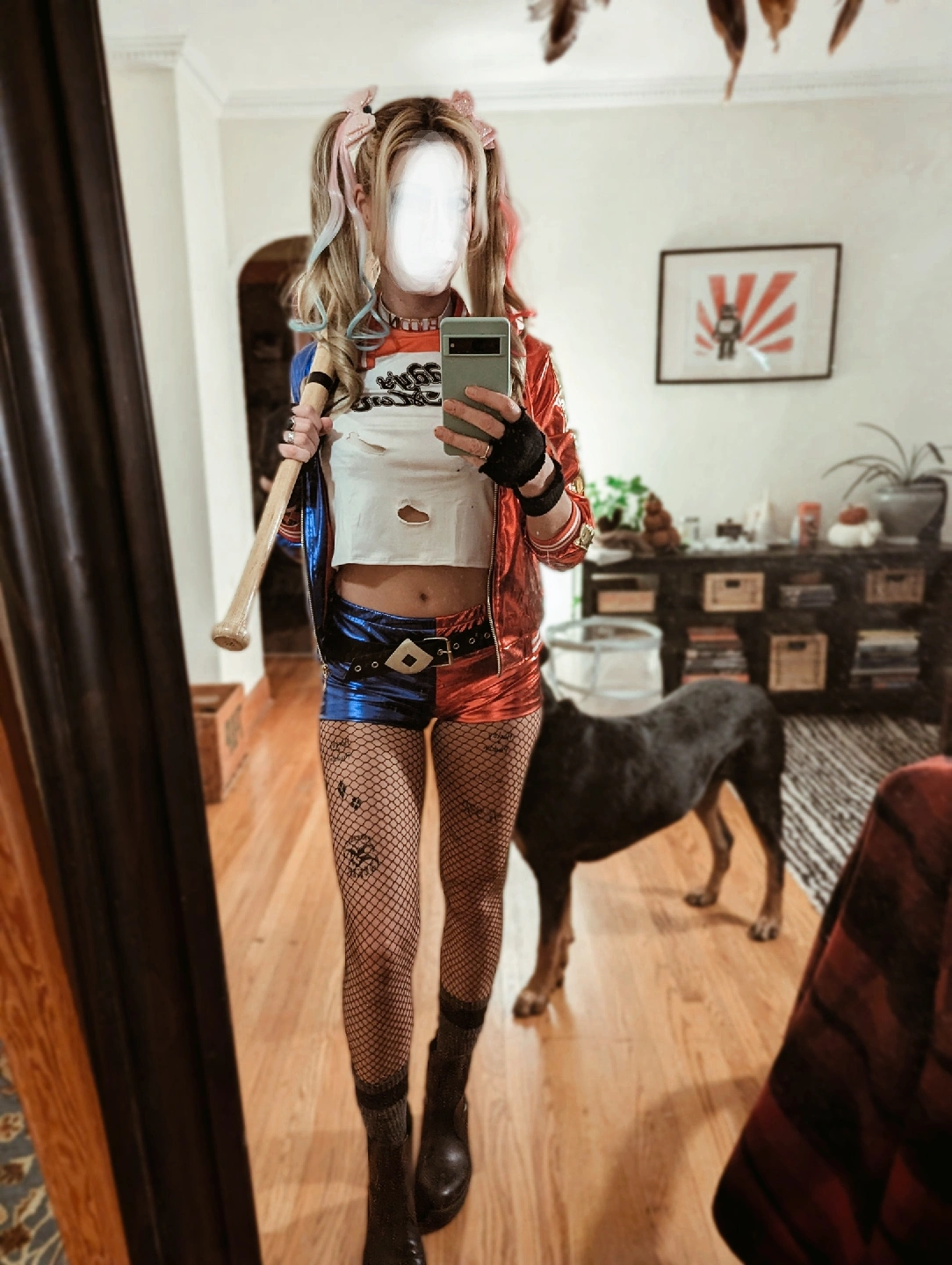 Selling a Harley Quinn costume set! It includes the jacket, top, shorts, belt, fishnet stockings and coloured hair clip ins.. Perfect for Halloween or cosplay. Used once. Size small