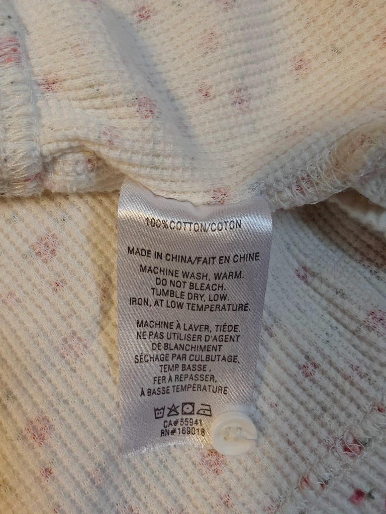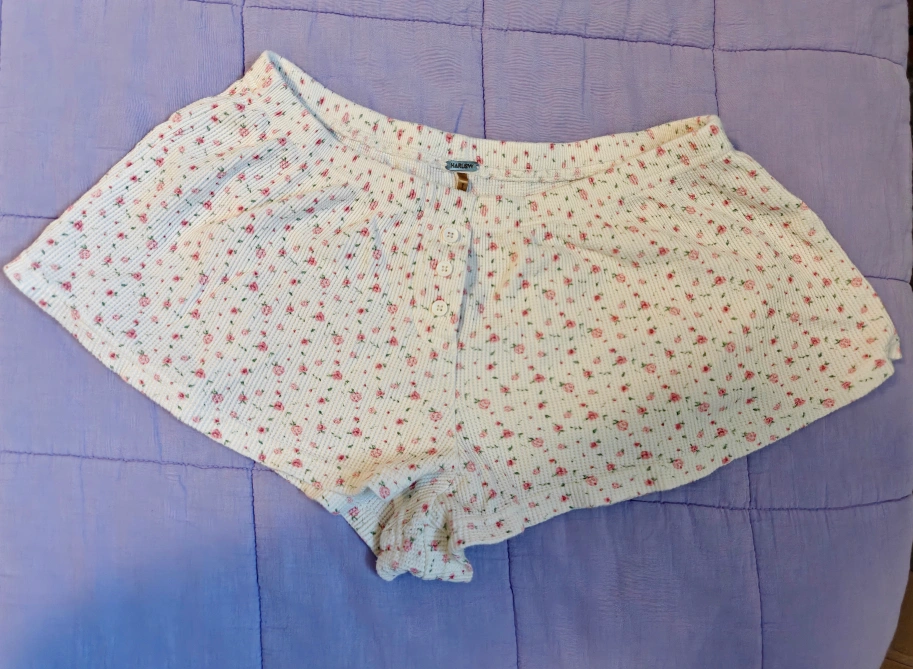 Cute Harlow floral shorts in size large! The material is 100% cotton, making them super comfy for lounging or sleeping. They feature a sweet floral pattern on a white background and have a button-up front. These are in great condition and ready for a new home!
